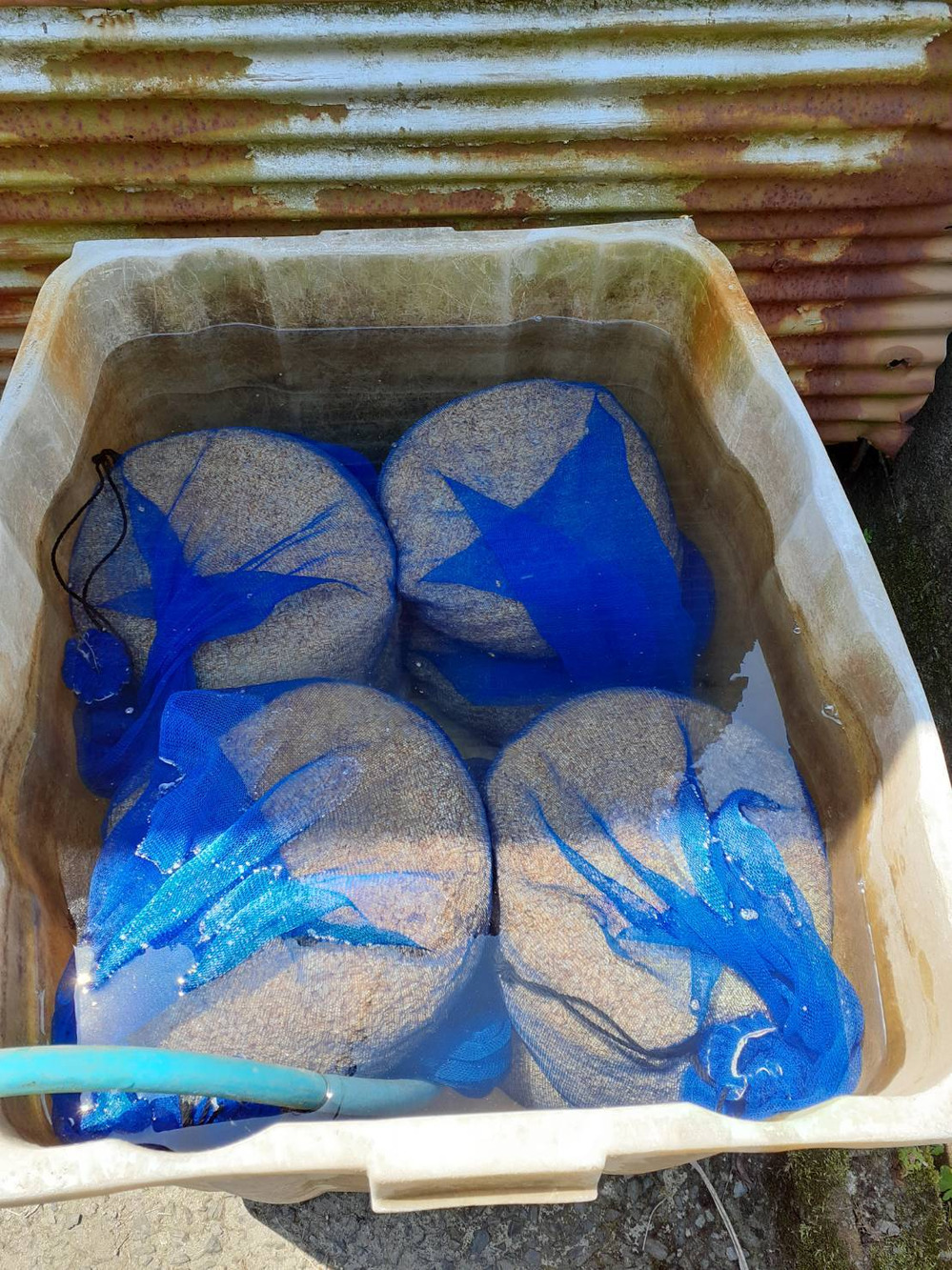 選別した籾種は、網に入れて3日ほど水に浸透し水分を吸収します。