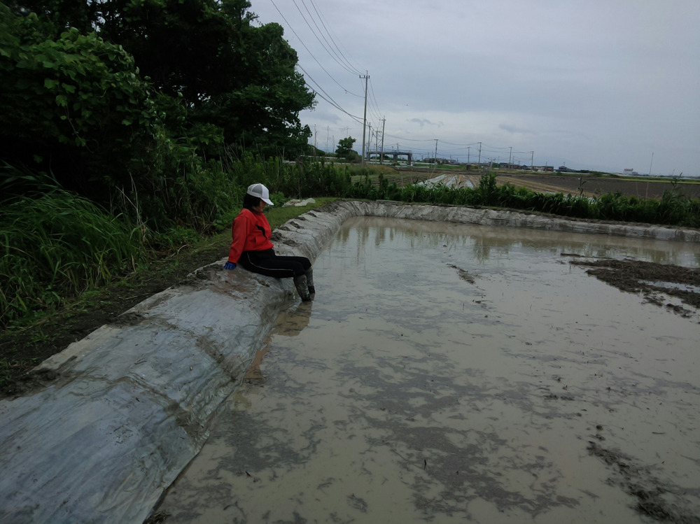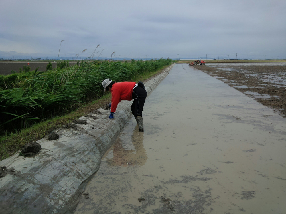 トラクターで水田周りを荒代掻きをし、ポリシートを川端アゼに水止め・草止めに張りました。