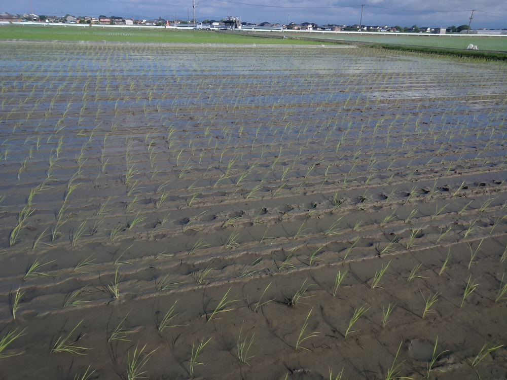 田植えを終わって1週間、この田んぼはジャンボタニシが存在するので、昼間は水を溜めて夜は落としています。