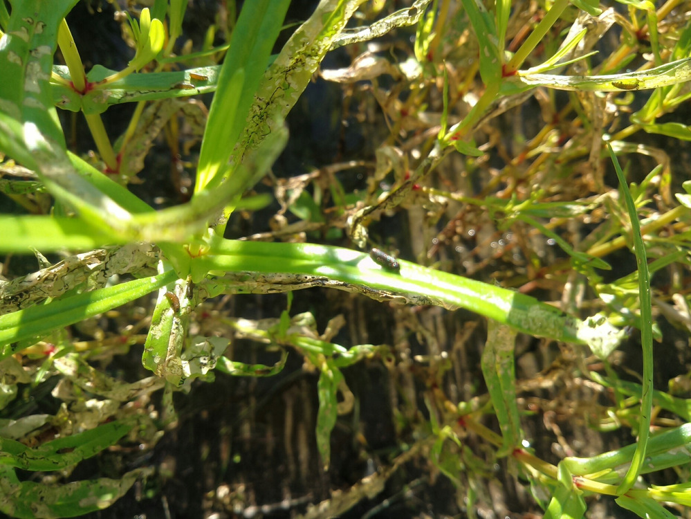 凄い勢いで、黒い虫の幼虫と思われる虫が、片っ端から雑草の葉を食べています。