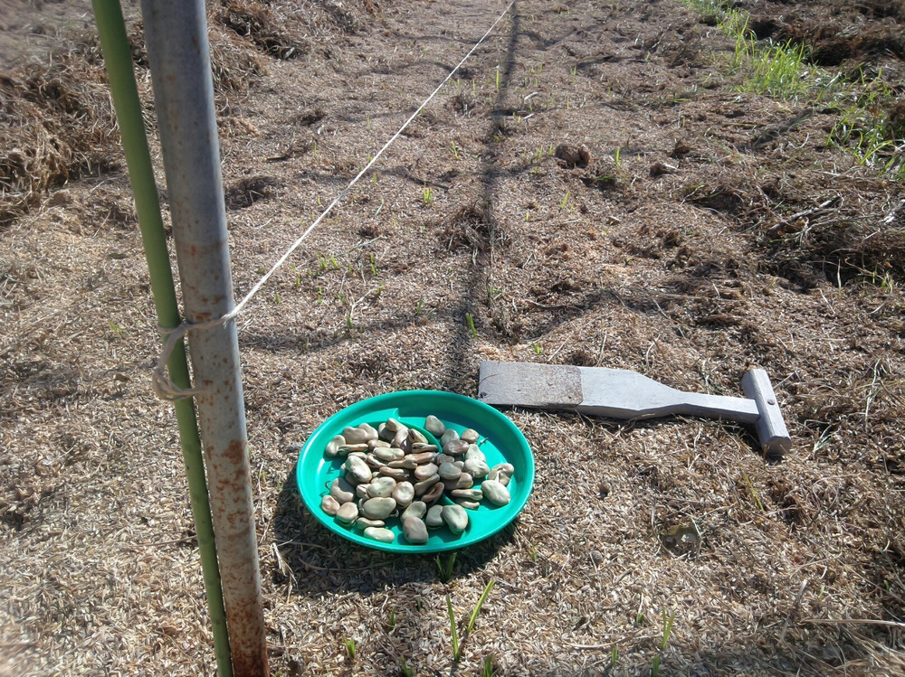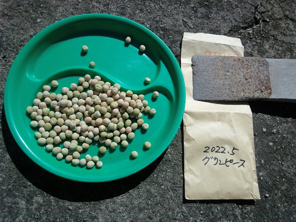 グリンピースを種入れする畑は、ヒヨドリ対策として、種蒔く所を草刈し、他は草を残したままとしました。