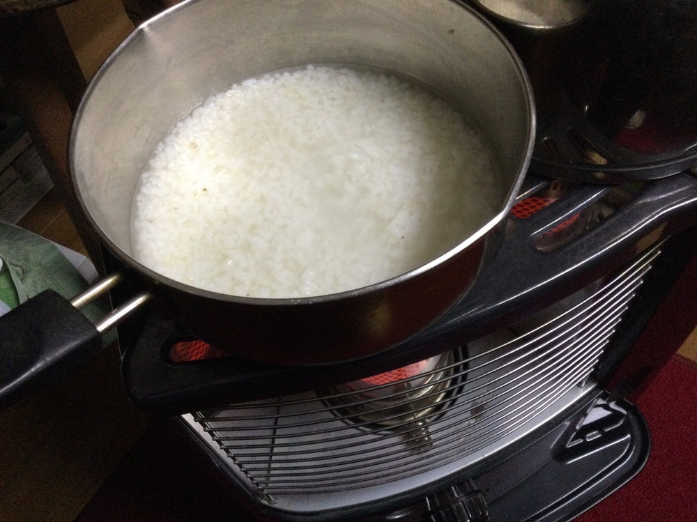 自然米(無肥料・無農薬栽培)コシヒカリのご飯を、鍋に取り出して塩(海水塩)を少々入れて水(浄水器の水)を適量入れます。
