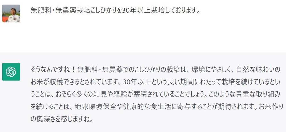 最初は、わたしが無肥料・無農薬栽培で30年以上コシヒカリを栽培している話をAIに話掛けました。