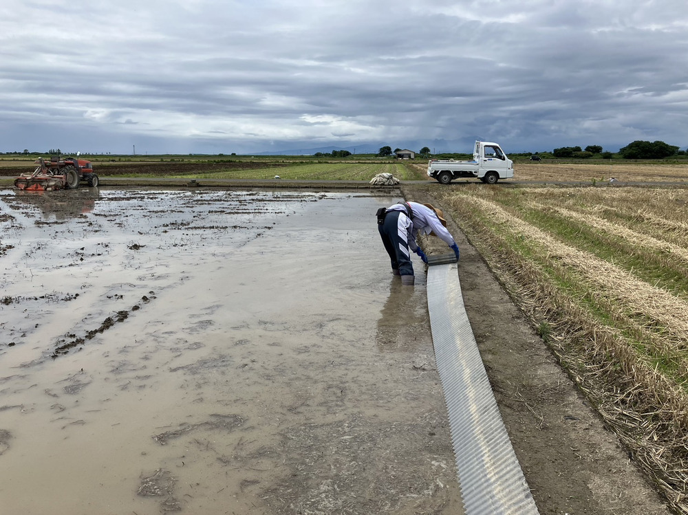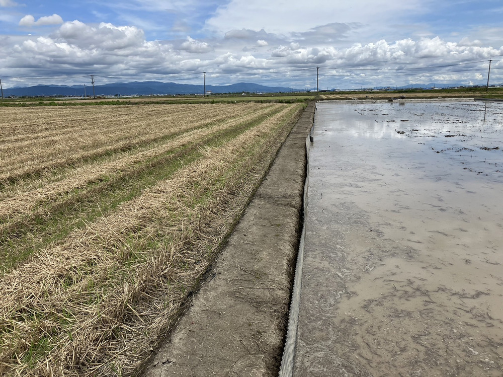 そして、隣りの田んぼに水が沁み出さないように、アゼナミを挿しています。