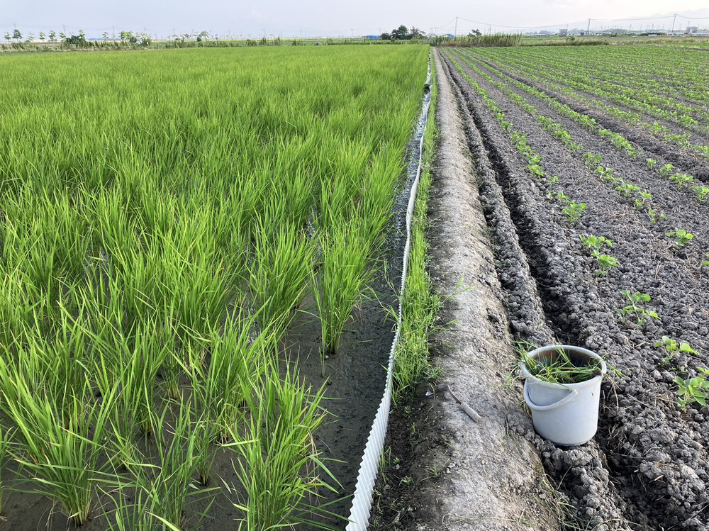 隣りが減反で大豆を栽培している所は、水漏れしないようにアゼナミを立て水止めしています。