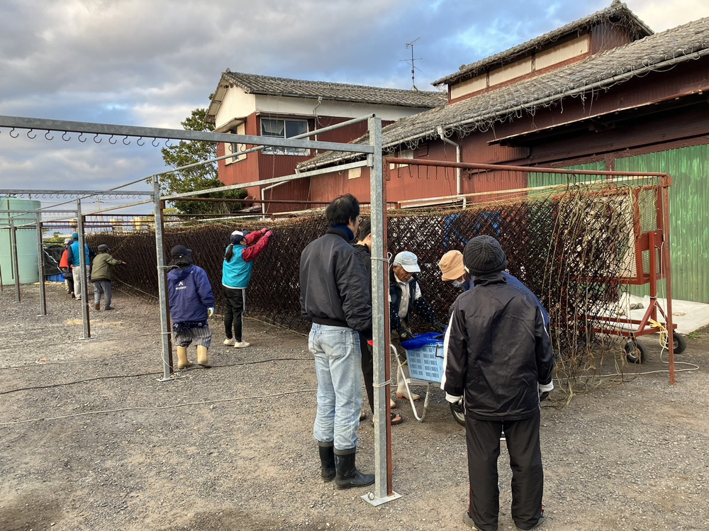 総勢約15名でわいわい楽しく網干し、そして冷凍庫に保管を行っております。