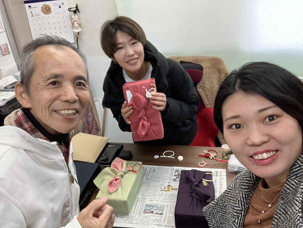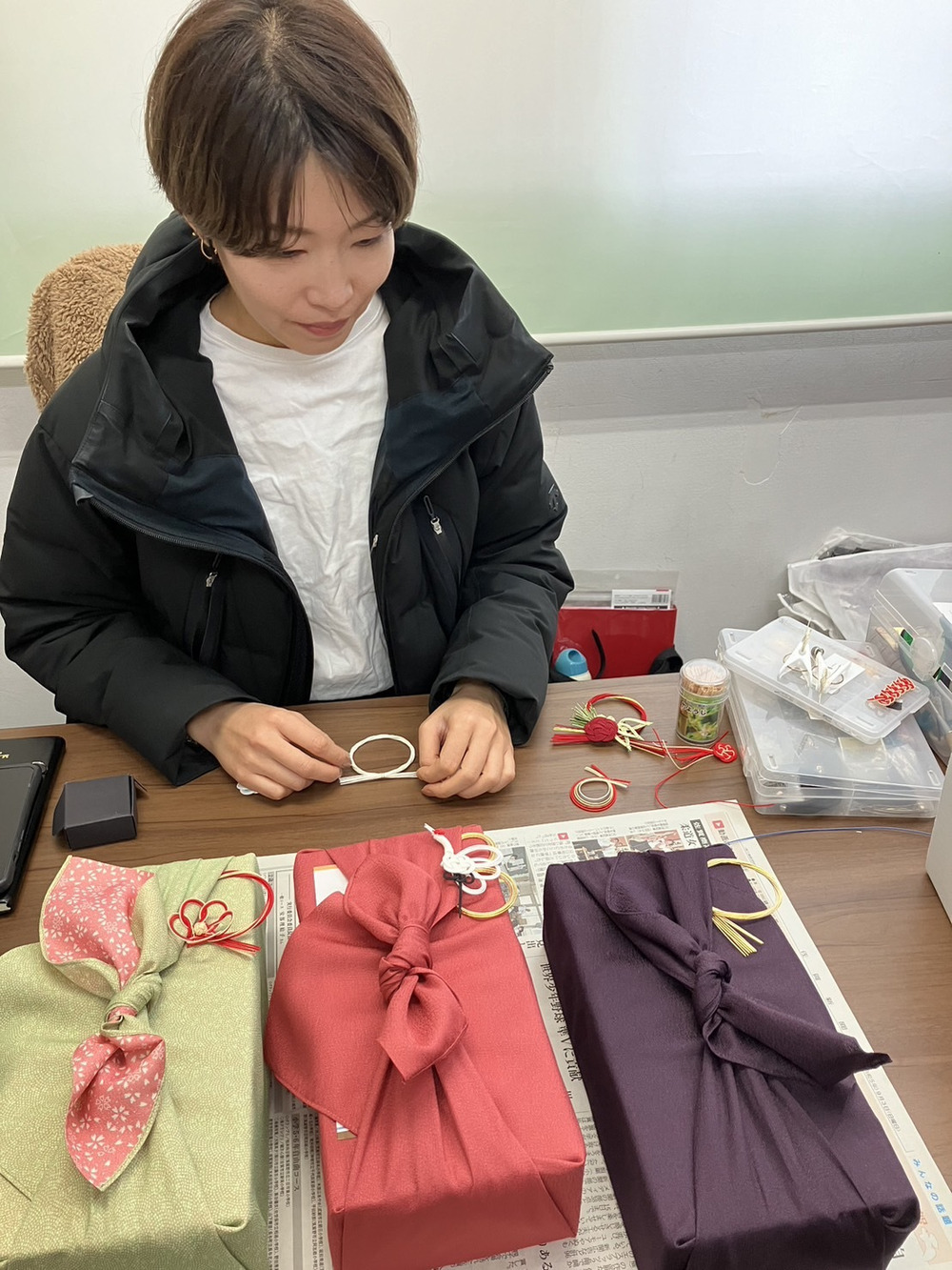 小川さんと緒方さんわたしと3人で知恵を出して、水引の配置・固定・デザインなどを話し合いしました。