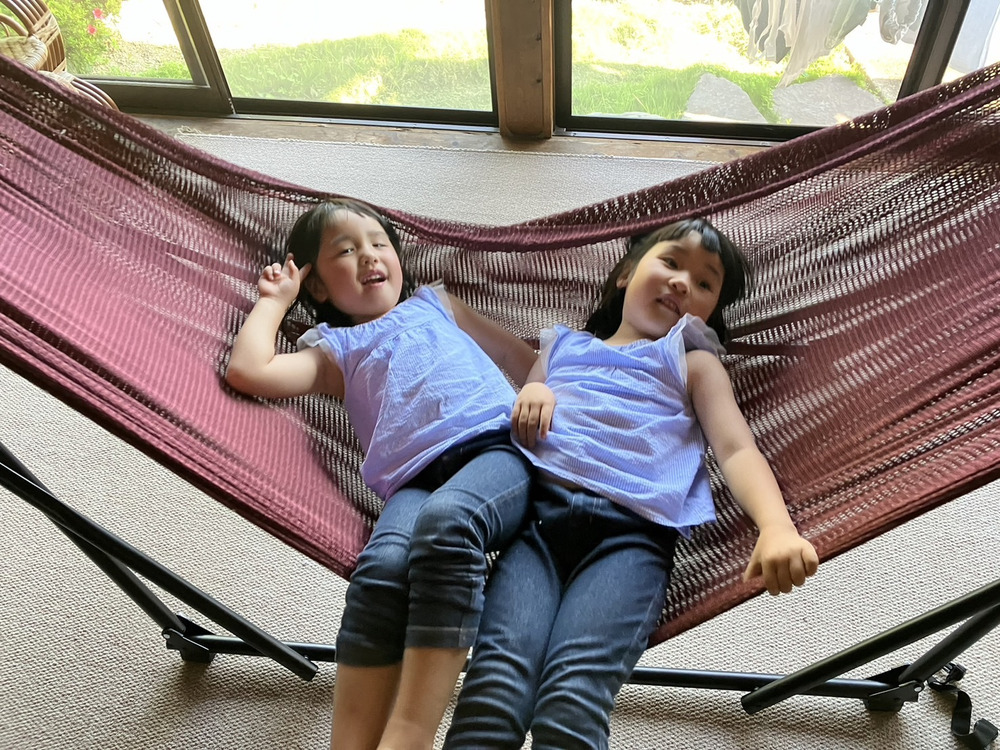 「ハンモックの楽しい誤用とリラックスのひととき」双子の孫たちに占領