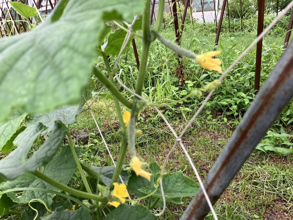 最近では、雌花も付き始め、今年は美味しいキュウリが期待できそうです。周りの草刈りをした草を、乾燥を防ぐために根元にたっぷりと被せています。この手間が、植物たちをさらに元気にしてくれます。