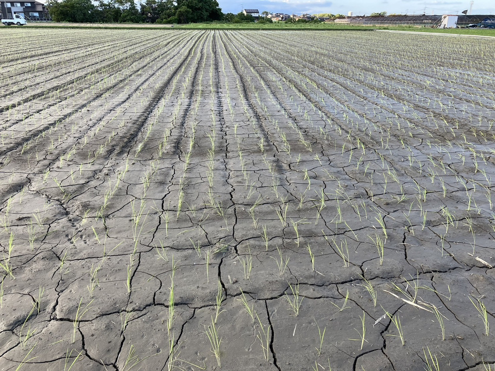 田植えを終えた後、約1週間ほど水を切って、ジャンボタニシから稲を守るために土を乾燥させています。今年はジャンボタニシが全ての田んぼに入っているため、どの田んぼも水を落として稲が食べられないように工夫しています。