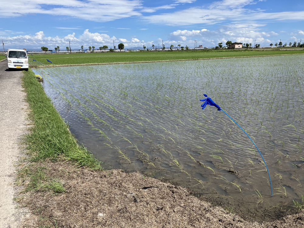 そこで、わたしは自分の田んぼに独自の印を付けることにしました。青いゴム手袋を棒に括り付け、目立つようにしました。