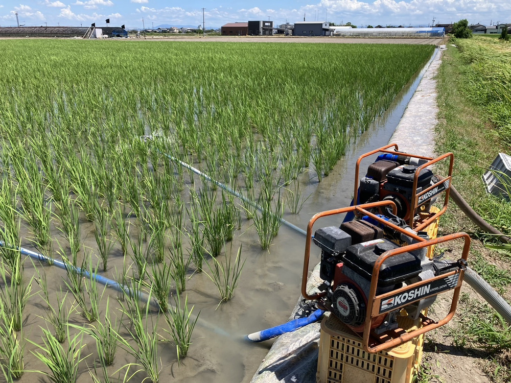 今年は、約3分の1が集団減反の影響で共同ポンプが稼働せず、自家用ポンプでほとんど毎日水を入れています。しかし、36度を超える猛暑が続くため、田んぼはすぐに乾いてしまいます。この暑さが自然米を大きく育て、虫の抑制にも役立っています。稲さんが美味しく成長してくれるのは、この暑さのお陰かもしれません。