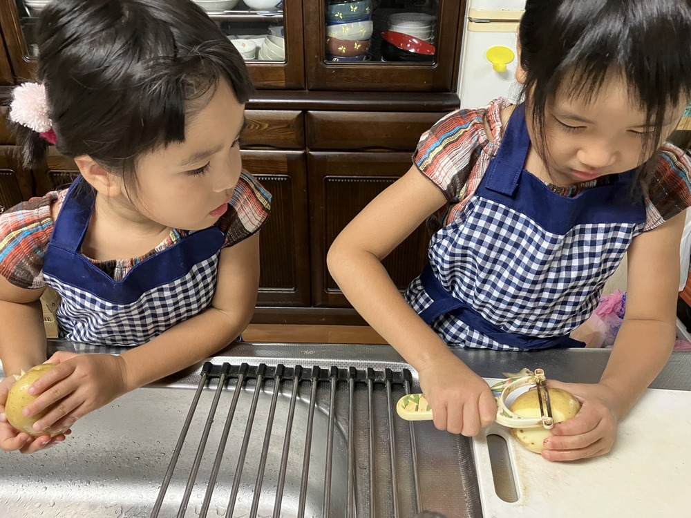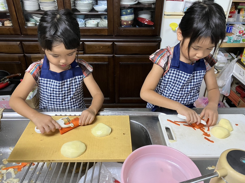 次は人参の皮むきに挑戦。初めて包丁を握ると、少し怖がりながらも、ママに励まされつつジャガイモを慎重にカットしていきます。今までなかなか時間が取れずにいたので、こうして一緒に台所に立つことで、良いコミュニケーションの時間が持てた気がします。