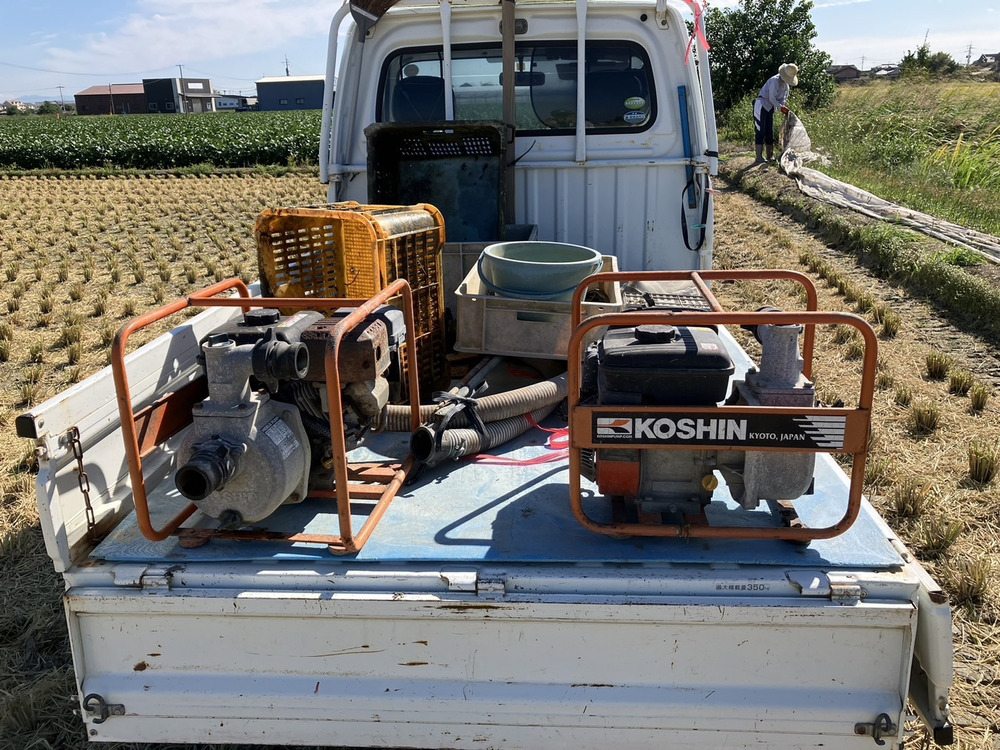私たちの地域では、集団減反に伴い共同ポンプの稼働が難しい場所もありましたが、そのような場所では自家用水揚げポンプを設置して対応してきました。そして、秋の収穫が無事に終わりを迎え、ポンプもその役割を終えて撤去の時期を迎えています。