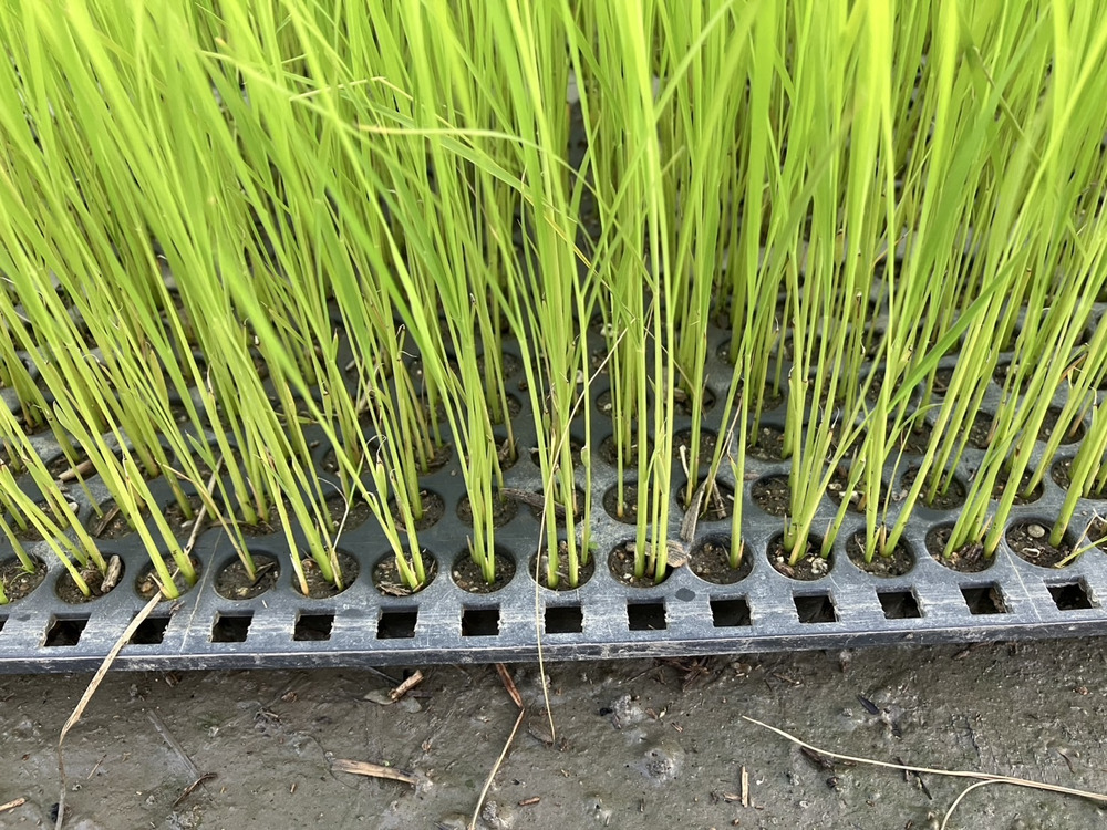 寒冷紗を外してからというもの、強風や日差しの強さにさらされながらも、30年DNAコシヒカリの苗たちは、ぐんぐんとたくましく成長しています。自然の中で鍛えられながら、日々その姿を変えていく様子に、ただただ感心するばかりです。