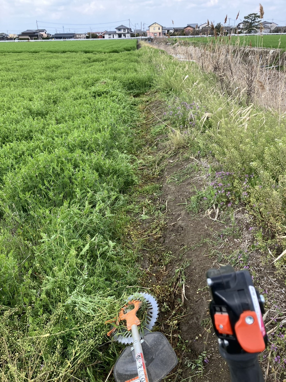今日は、田んぼの耕運を始めるために、アゼとの境が分かるように草刈りをしました。