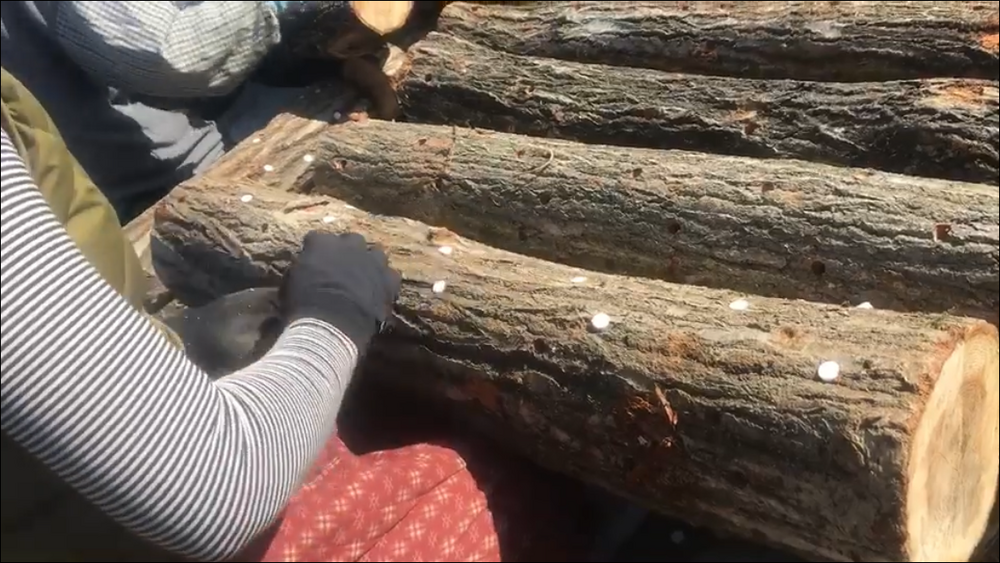 1m程の生の木にドリルで穴を開けています。そこに、成型ゴマという菌種を入れます。こうして寒い時期に植菌し、しい茸菌が原木内へ菌糸が伸びていくように仮伏せという段階へ移っていきます。