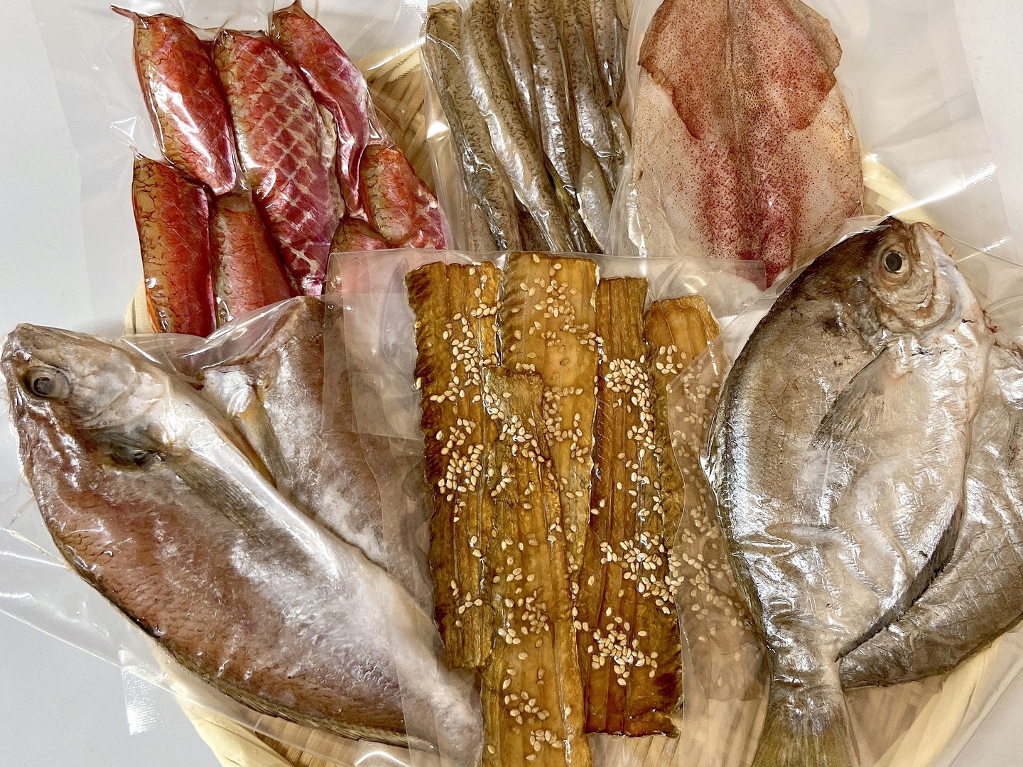 真鯛、アジ、カマス、クチ、イモエソ、イカ、タコ、イトヨリ、ヒメジ(金太郎)ウボゼ、太刀魚味醂干し、ヒイカなどその他