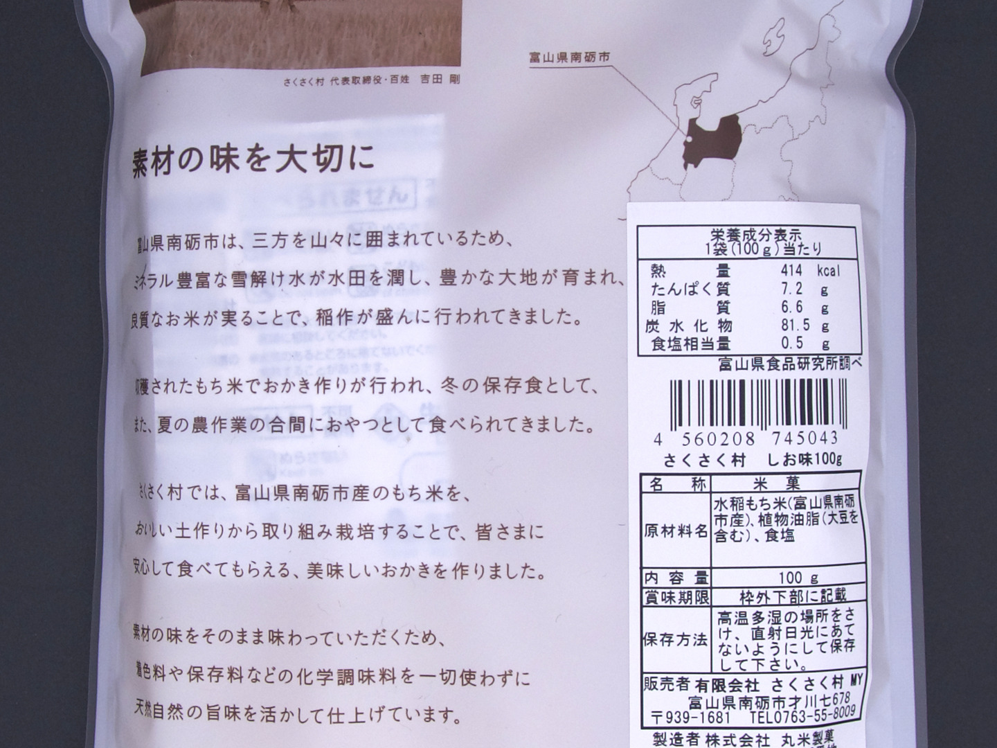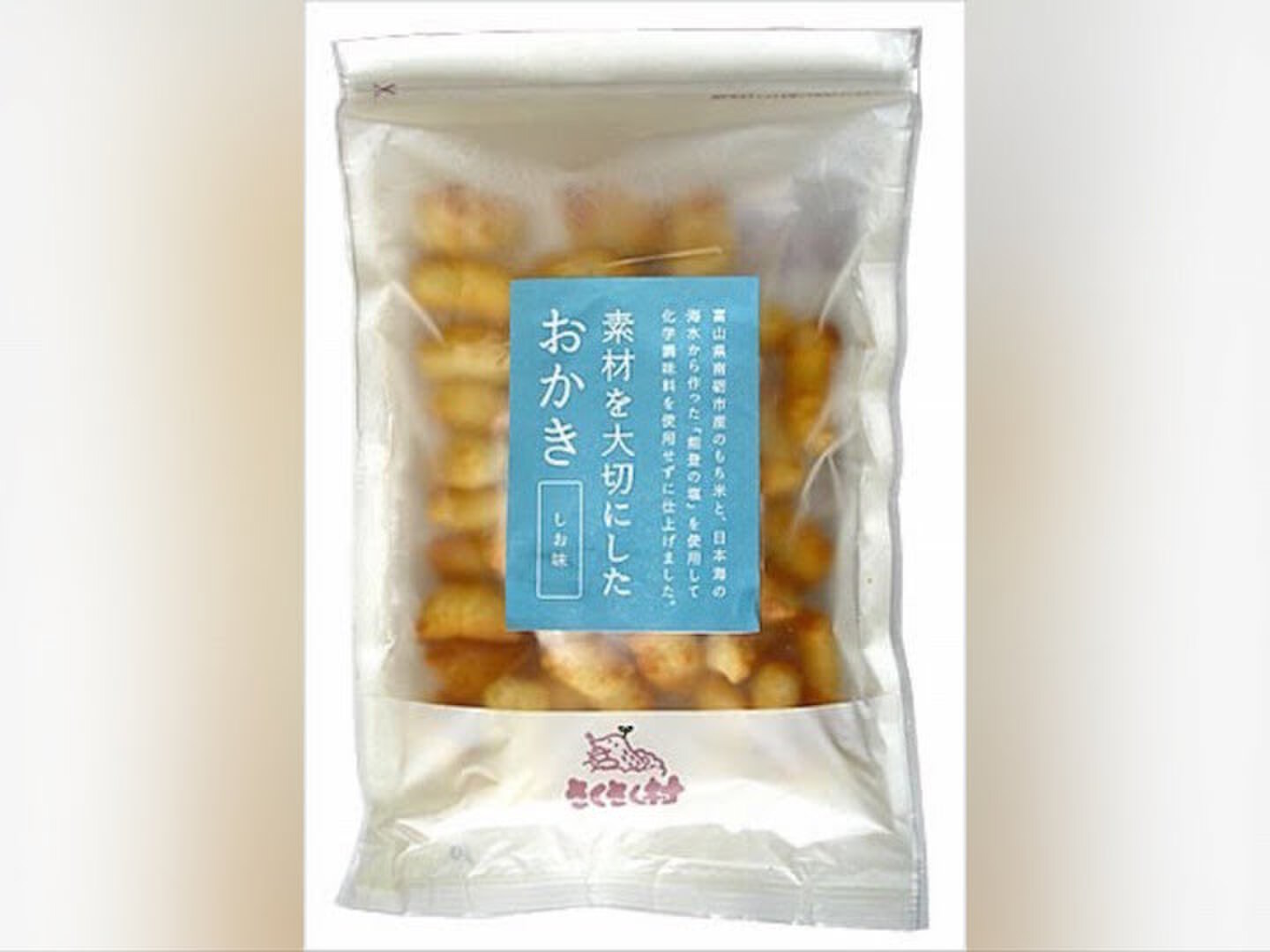 富山県南砺市産のもち米と、日本海の海水から作った「能登の塩」を使用して化学調味料を使用せずに仕上げました。