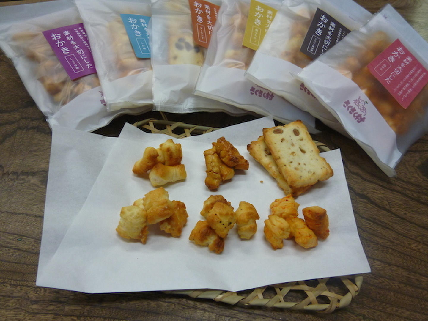 もともと南砺市旧福光町地区は、おかきを作る技術が高く、米菓会社も多い。全国的に外国産米や、もち米の粉を使う会社が多い中、「丸粒のもち米を使用」し、昔ながらの製法で作ったおかきです。