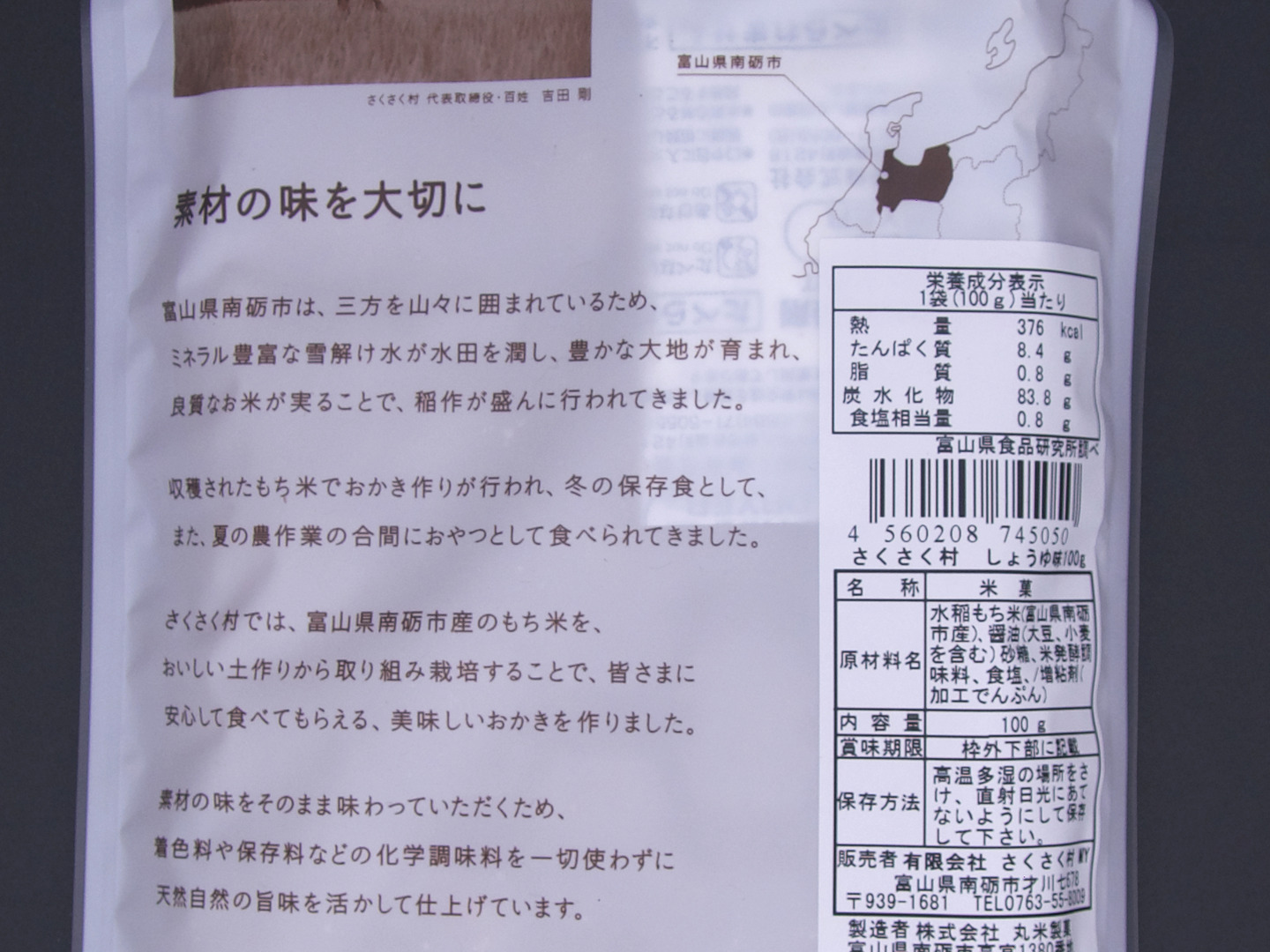 富山県南砺市産のもち米と、石川県の直源醤油「もろみの雫」を使用して化学調味料を使用せずに仕上げました。