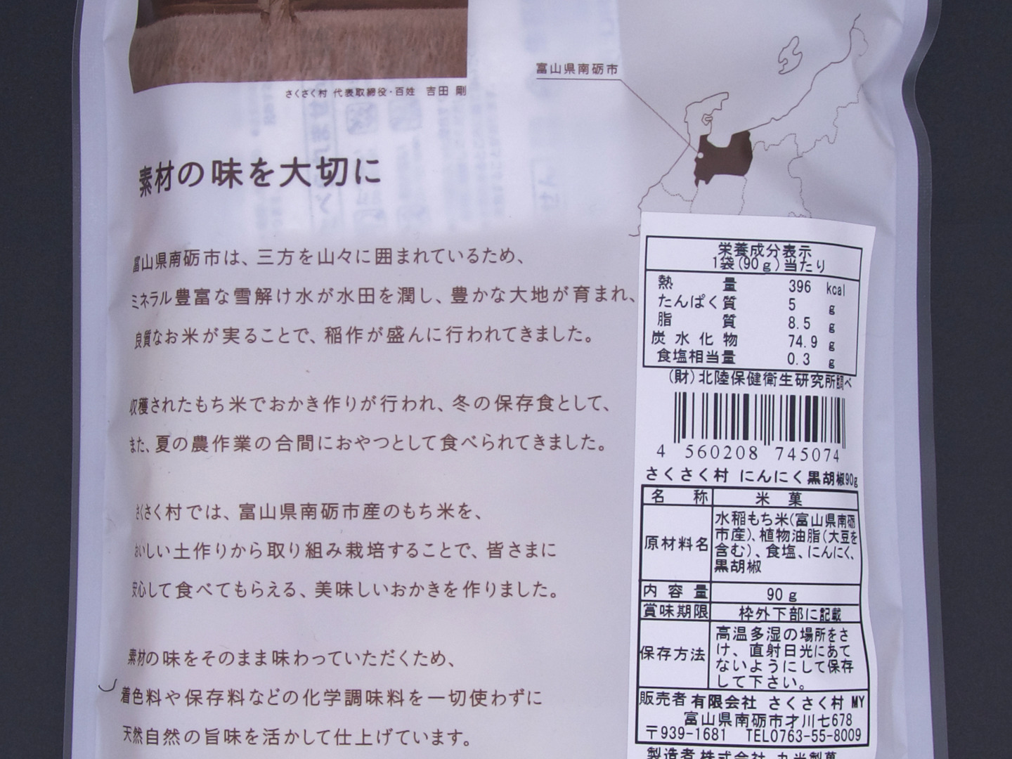 富山県南砺市産のもち米で作ったおかきに、にんにくと黒胡椒をピリリと効かせ化学調味料を使用せずに仕上げました。