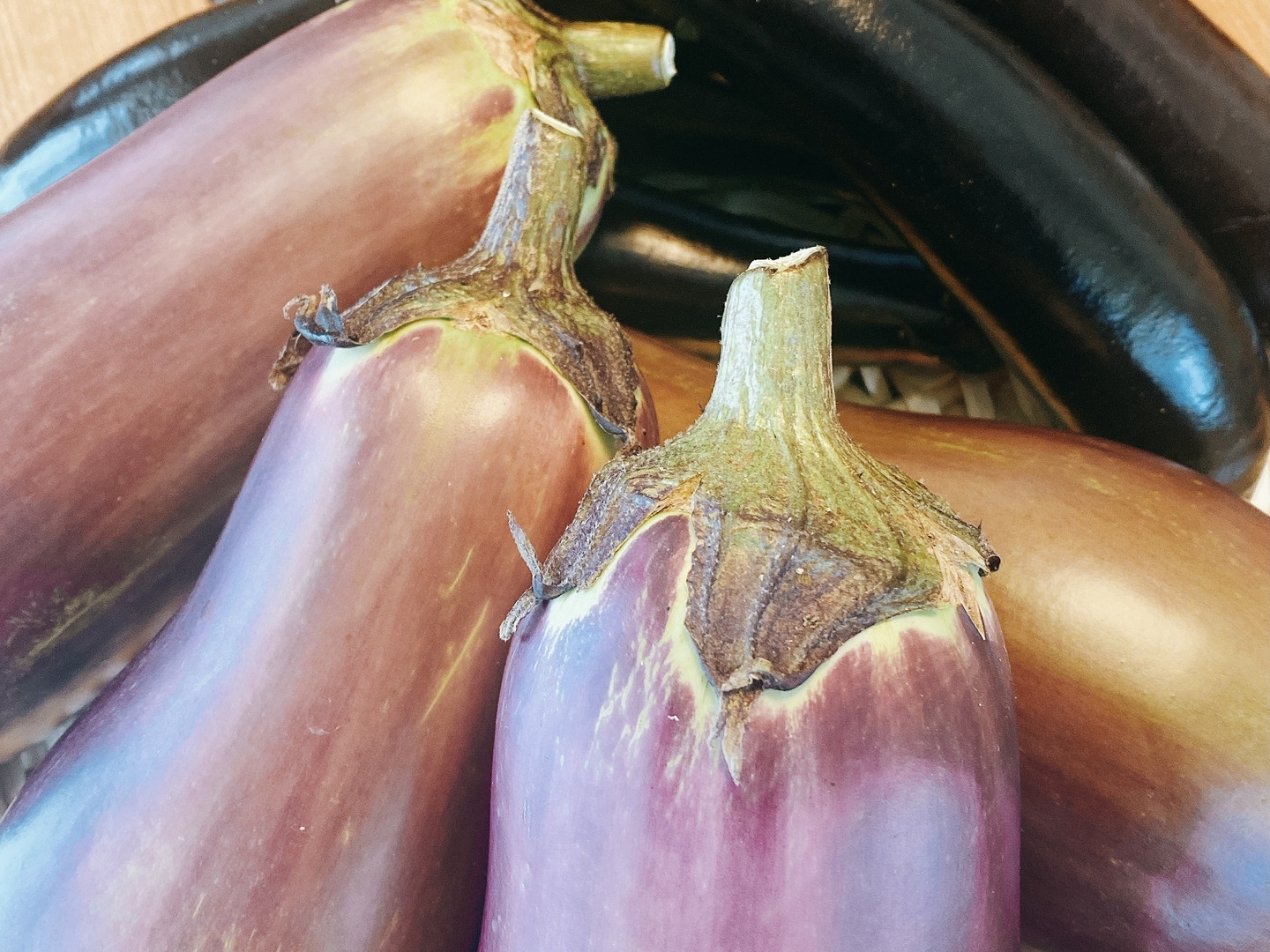 一般的なナスの品種ですが、少しすらっと長い品種のナスです。果肉は柔らかく、焼いて良し、煮て良し、揚げて良しなオーソドックスなナスですので、どんな調理方法でもOKです。