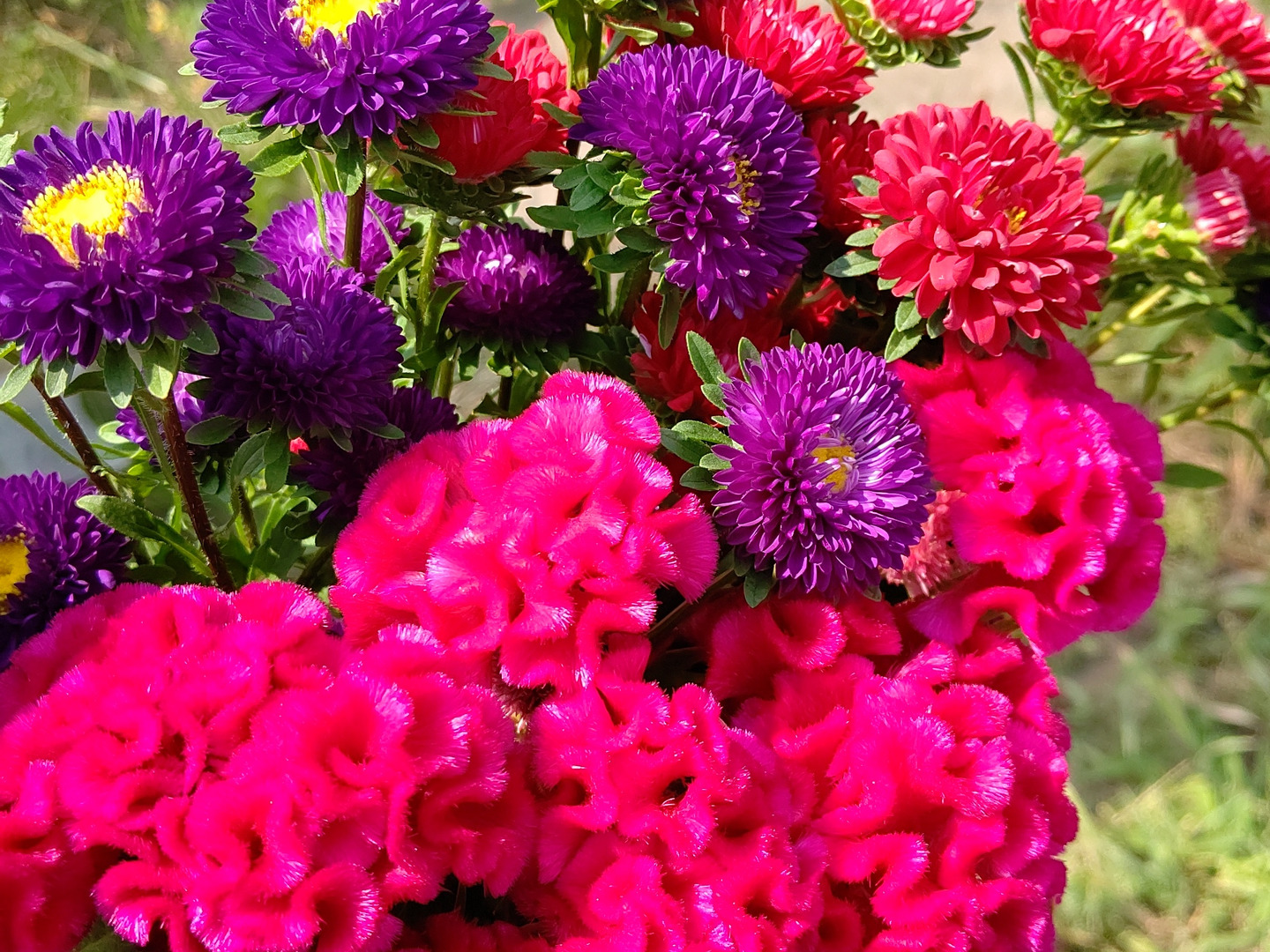 アスター赤色5本、アスター紫色5本、ケイトウ赤色10本の合計20本入りです。