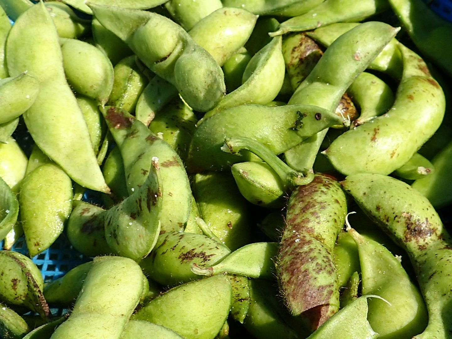 枝豆は一般的には緑色したサヤを連想しますが、10月下旬になるとサヤが薄黄色になり中の豆は薄黒くなり、枝豆としては見た目が悪く見えます。しかし、この頃に枝豆の味覚とコクは最高になります。11月初旬も楽しめます。