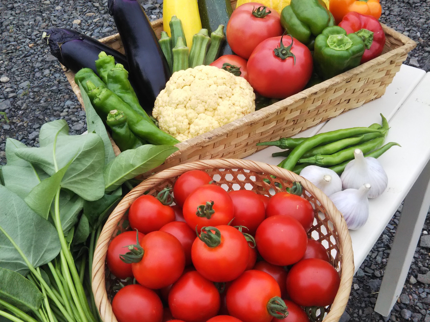 少量多品目栽培をしていますので、写真は一例で、他の野菜が入ることもあります。中玉トマト以外の詰め合わせ内容はおまかせになりますが、普段使いの定番野菜から、少し珍しいものまで、バランスを考えてお作りします。