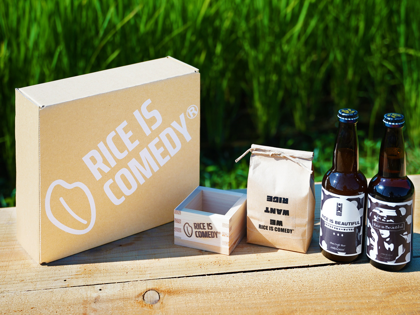 滋賀県の琵琶湖最北端にある西浅井町というまちで、地元出身の20~30代のメンバーが集まって『RICE IS COMEDY(米づくりは喜劇だ)』というコンセプトを掲げ、1000%楽しみながら米づくりを行い育てているコシヒカリと原料にコシヒカリを使用したクラフトライスビール、オリジナルの1合枡をセットにしたギフトセットです。