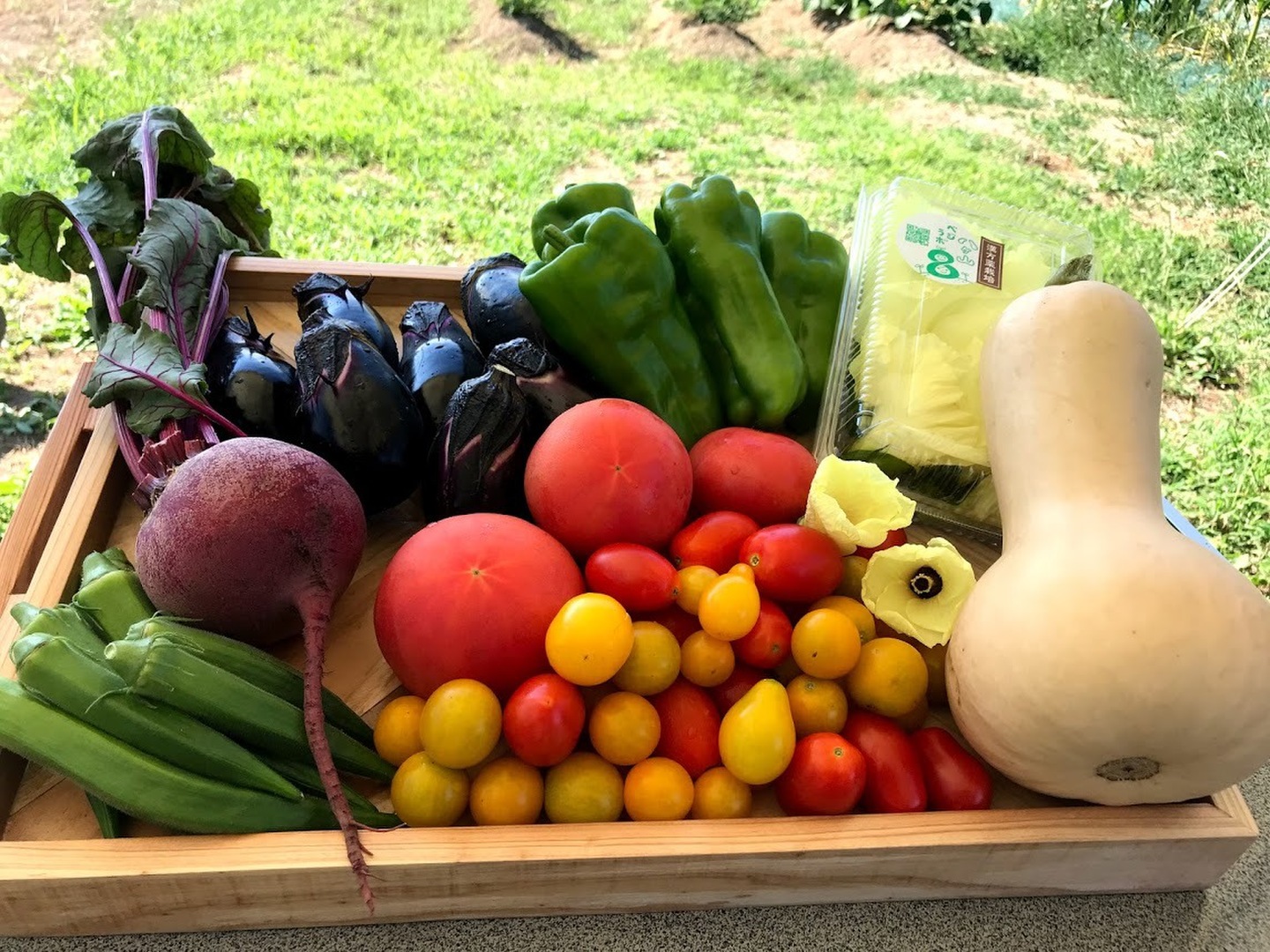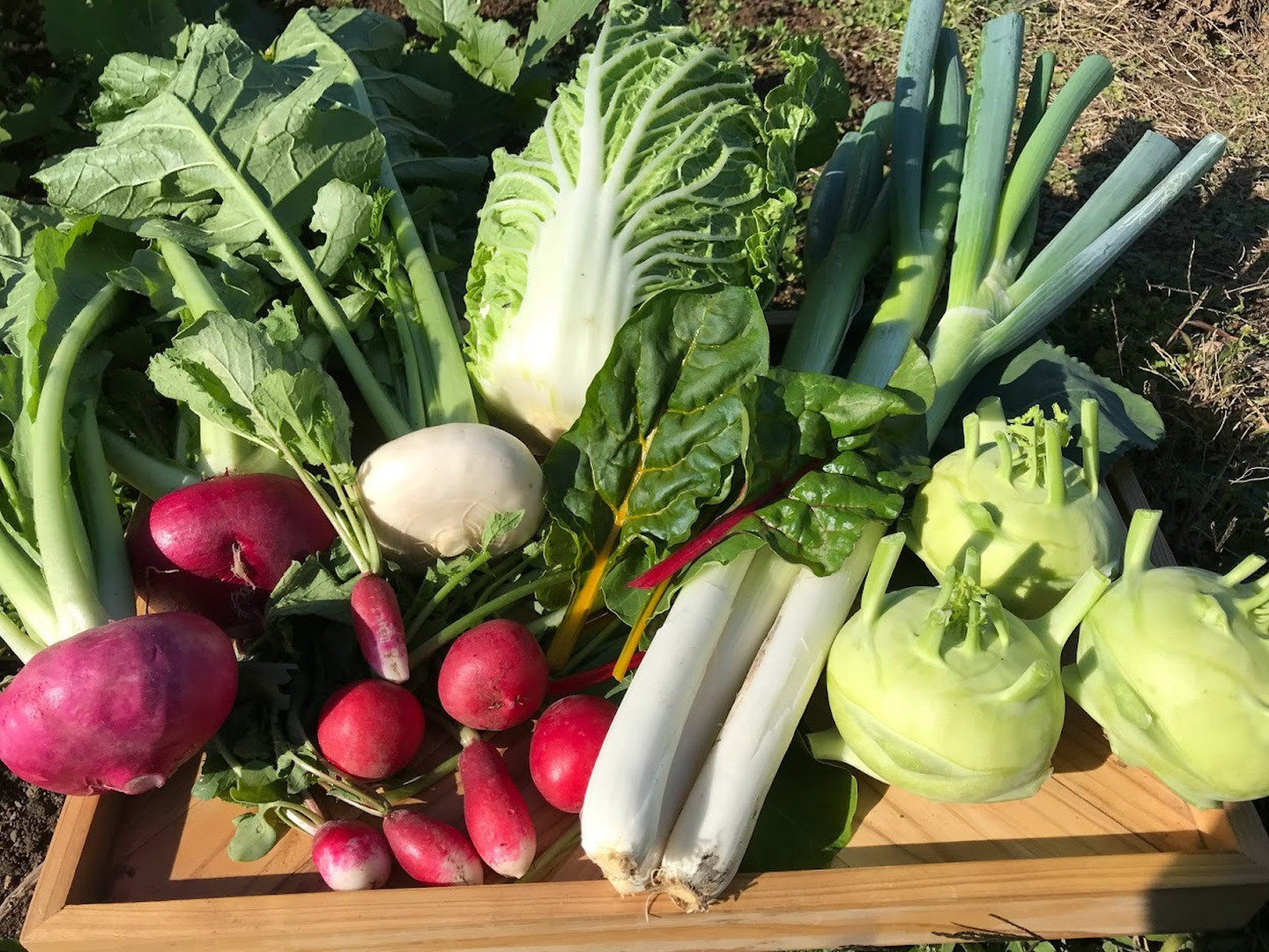 今回の旬の野菜セットにはこんなお野菜たちが8~10種類入っています。(露地栽培なので天候によって入るものが多少変動します。ご了承ください。)