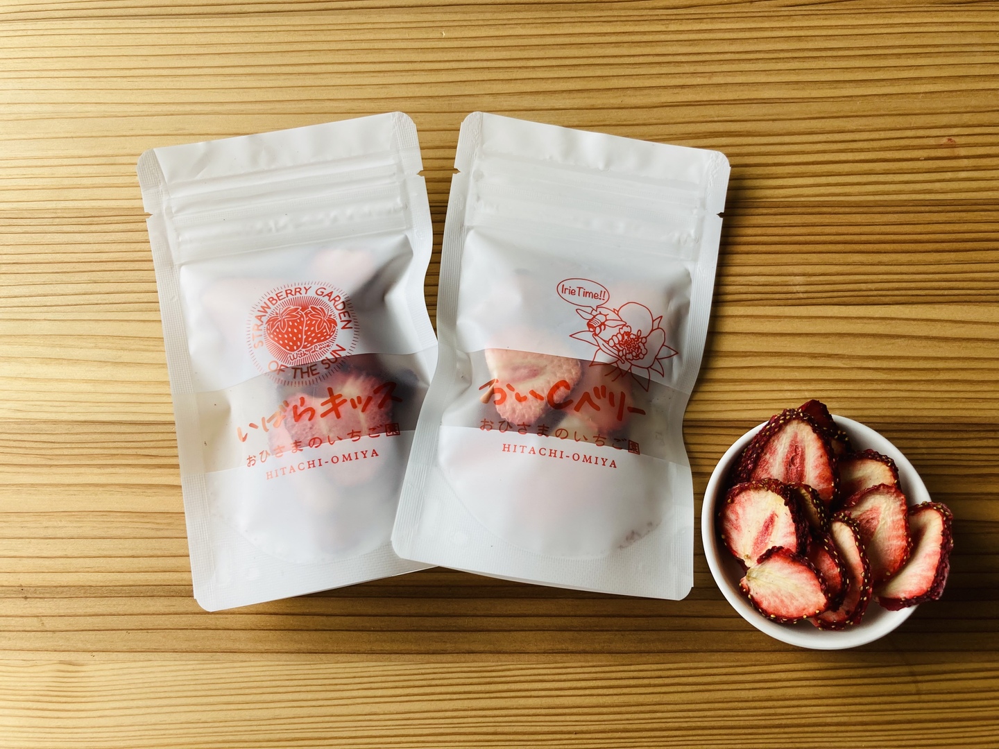 茨城県オリジナル品種“いばらキッス”と、ビタミンCが通常の約1.5倍入っている“おいCベリー”の乾燥いちご、2品種セットになります。