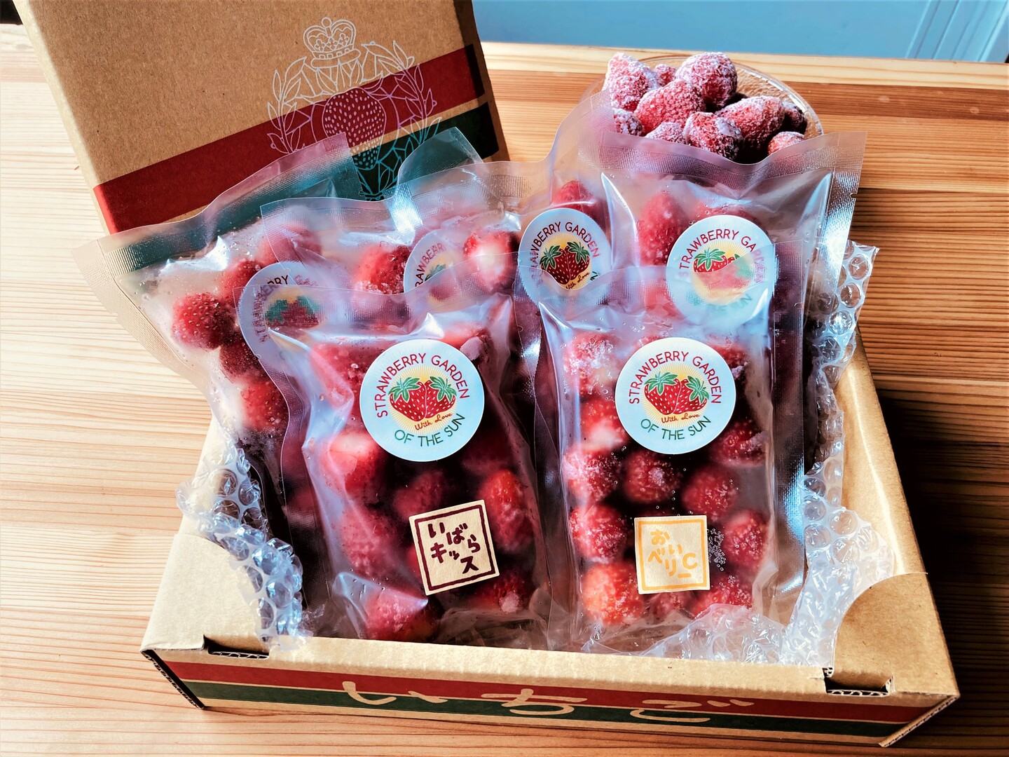 茨城県オリジナル品種“いばらキッス”と、ビタミンCが通常の約1.5倍入っている“おいCベリー”の2品種の冷凍いちごを、各5袋づつ、計10袋のセットになります。