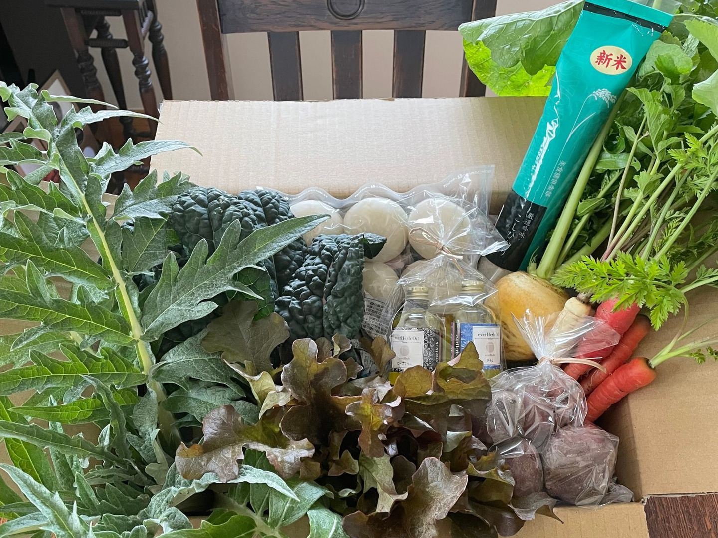 無洗米コシヒカリと玄米300g(2合)✖️各1袋、ハーブオイル小瓶2本、イタリア野菜約2~3人分