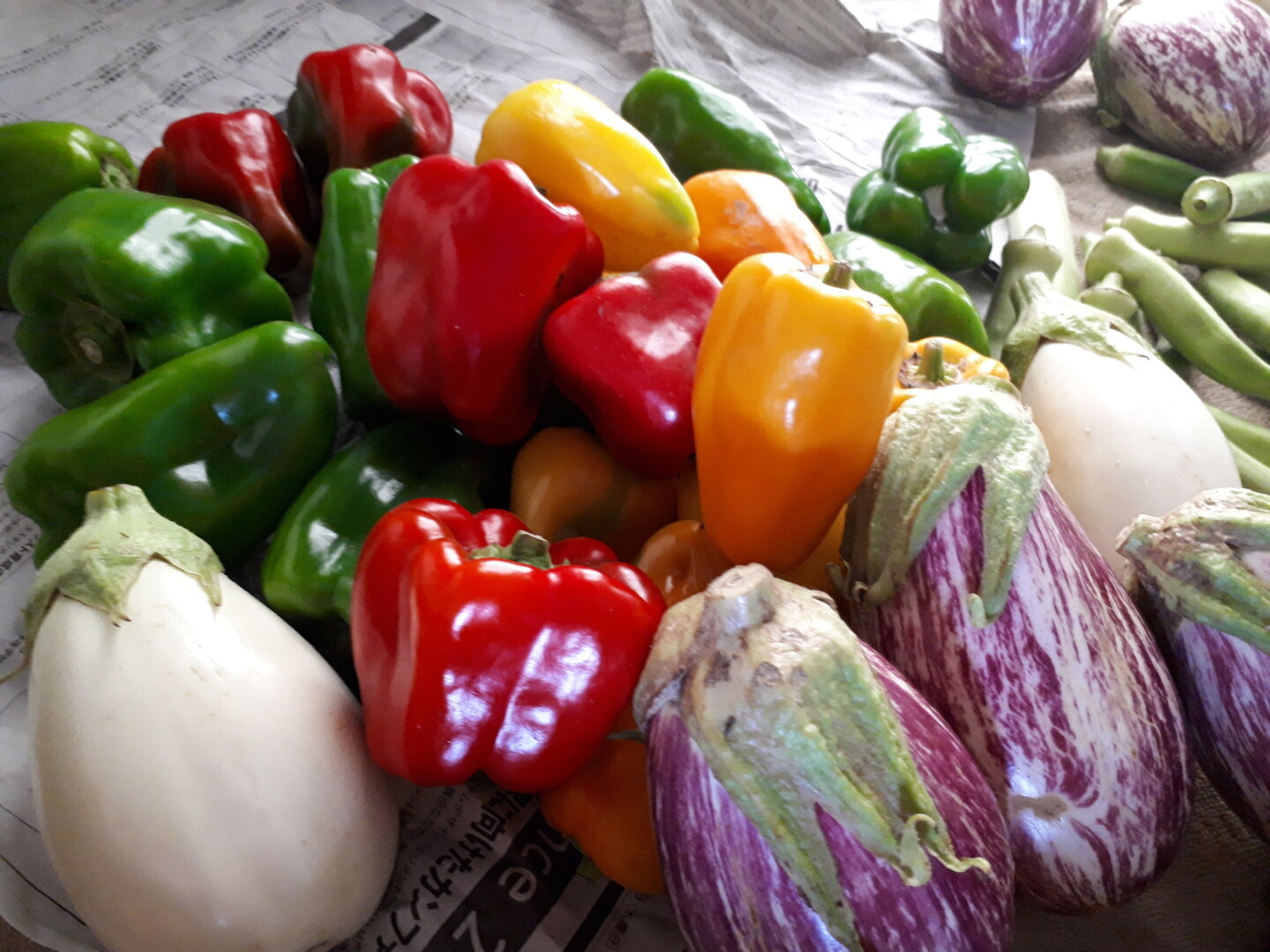 モロヘイヤ、つるむらさき、空芯菜、小松菜、キャベツ、ナス、ピーマン、ミニトマト、きゅうり、ゴーヤ、ズッキーニ、オクラ、じゃがいも、人参、 等