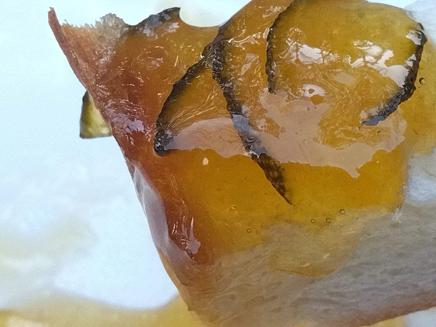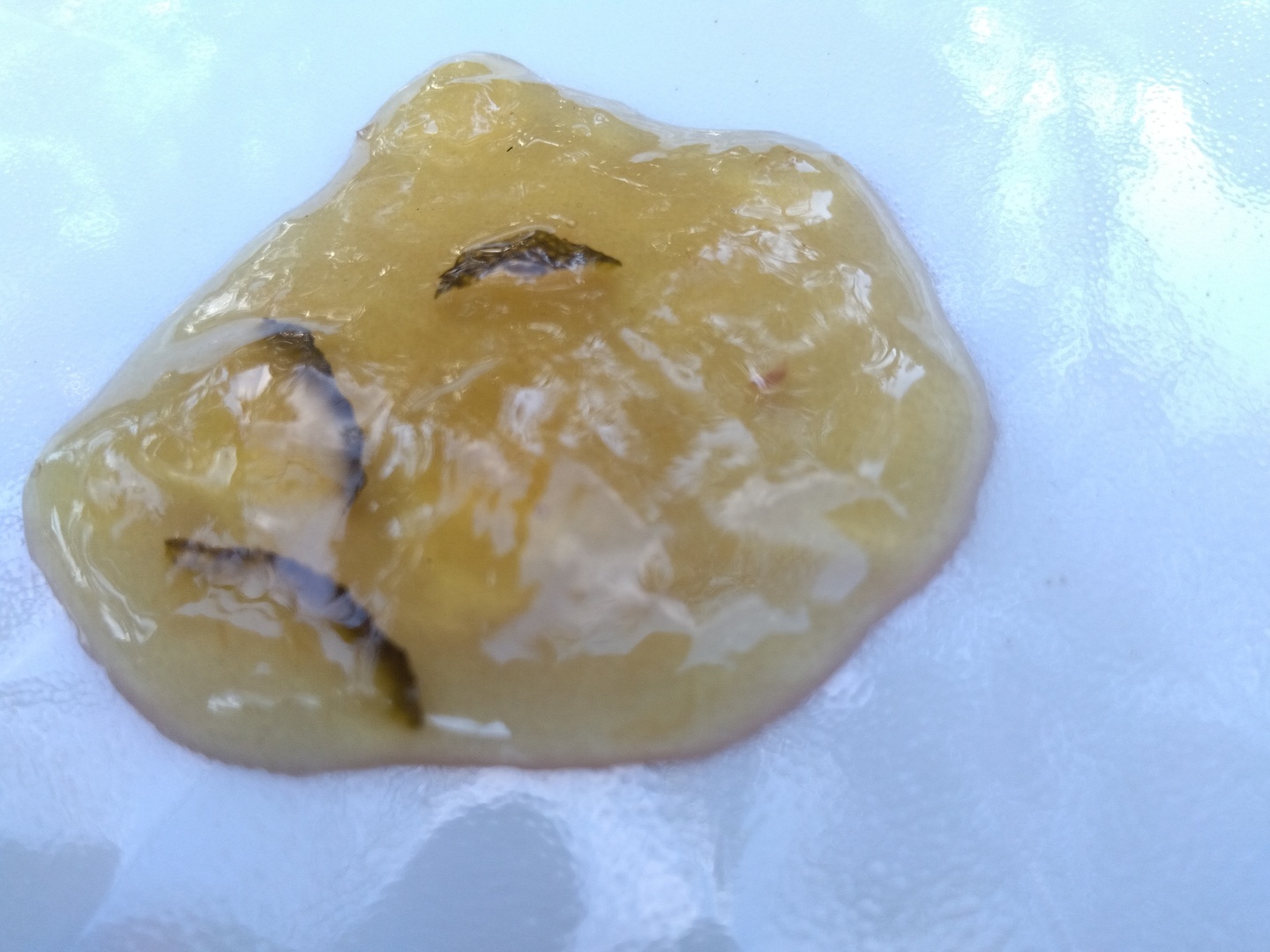 蜂蜜の中に 細かく刻んだ柚子の皮が入っている イメージです。皮は 生の風味で、触感も プチプチしていますが、しっかり火を通してあります。皮が硬くて邪魔になる・・ほどではありません。皮が底に沈んでいる場合はスプーンで 底に溜まった皮をすくいながらお召し上がり頂くうちに なじんできます。