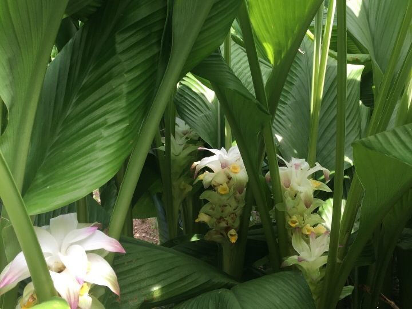 ・葉が背丈ほどに成長した頃に、葉の根元に白い花を咲かせます。ピンク色の花を咲かせる春ウコンの葉の裏はビロードのような絨毛があり、秋ウコンには絨毛がないため春ウコンと区別されます。