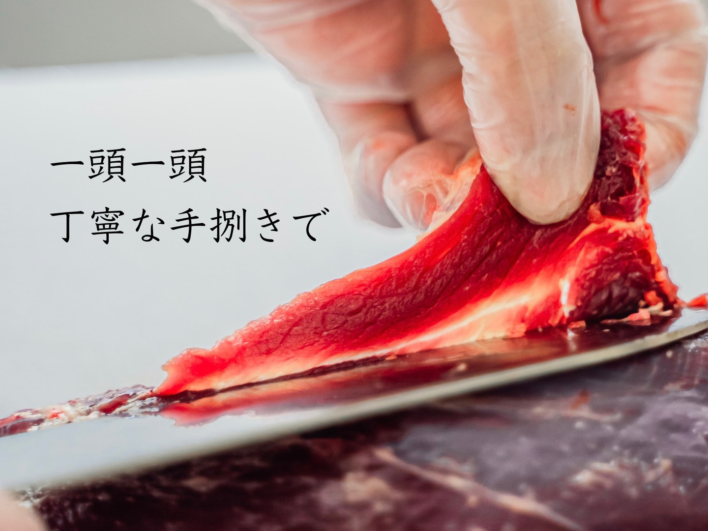 弊社では、捕獲から処理・販売まで一貫して行います。保健所の許可を受けた食肉処理施設「やまとある工房」にて製造するため、安心安全な鹿肉です。 美味しい鹿肉を製造するため、徹底された血抜き・素早い処理・丁寧なトリミングにこだわっています。仕入れでは、箱罠やくくり罠による捕獲を行い、広場にて一時的飼育することで、安定的な供給と肉質を確保しています。そのため、旨みの詰まった柔らかい肉質を実現することができるのです。