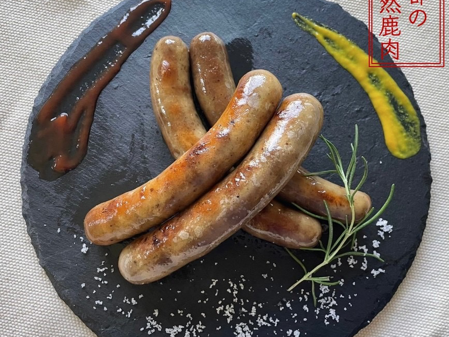 ソーセージ(鹿肉、豚肉、豚脂、塩、香辛料、さとう、ニンニク、天然羊腸)