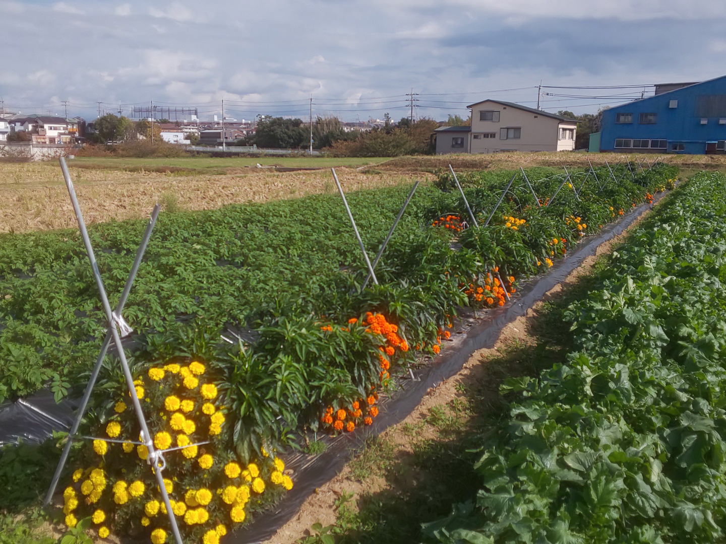農薬を一切使用しない為に、自家製の虫除け(お酢に鷹の爪とニンニクを入れて稀釈)を使い、コンパニオンプランツ(共存共栄)として、マリーゴールド等を脇に植えた栽培をしてます。