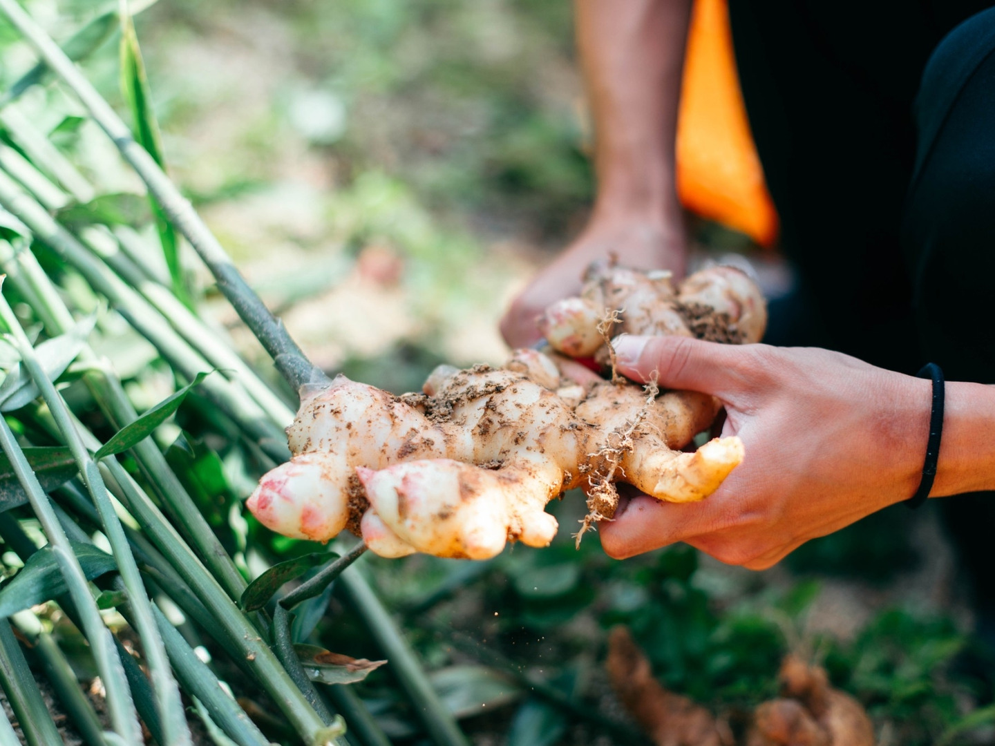 杉本農園では、生姜作りは土づくりだと考えています。阿蘇の雄大な自然で育った野草や鶏糞、イワシ・マグロ等の魚粉有機肥料・微生物を使用しています。微生物の動きを最大限に活かした土づくりを行っています。