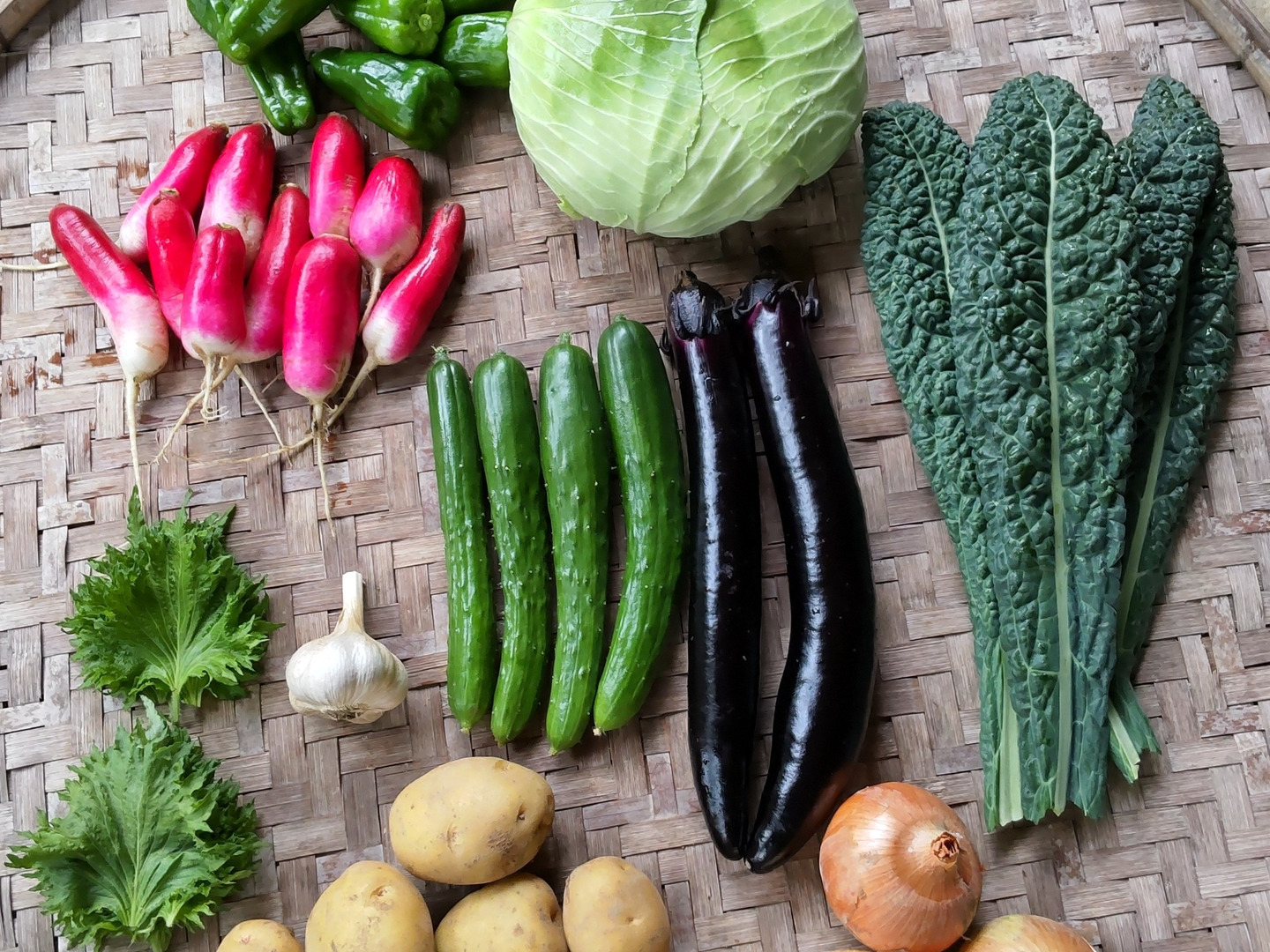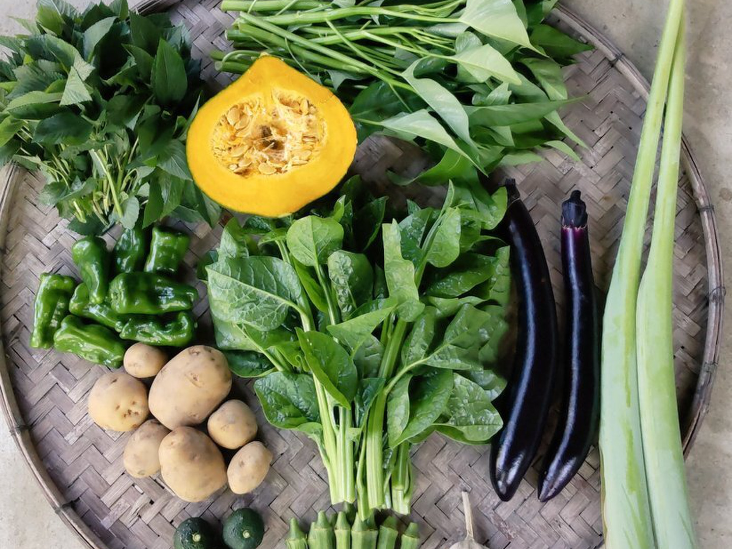 7月27日現在、ピーマン、大葉、つるむらさき、空芯菜、モロヘイヤ、きゅうり、ゴーヤ、じゃがいも、九重栗かぼちゃ、青柚子、なす、ついも、キャベツ、にんにくの中から、7~11種類の新鮮野菜をお届けしております。