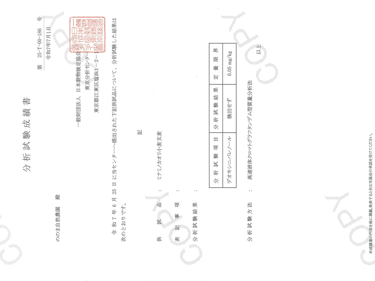 商品について あわせ買い対象 同生産者の別の「あわせ買い対象」商品と一緒にご注文いただくと、送料をまとめてお届けできる場合があります。 生産者からのお知らせ 複数商品の同梱をご希望のお客様へ「あわせ買い対象」となっている商品は同梱して発送できますが、注文が別々になってしまいますとそれぞれに送料がかかってしまいます。同梱希望の場合は1回の注文にまとめるようにお願いします。「あわせ買い対象」以外の商品の同梱は、《ご注文の前に》お問い合わせください。 もっと見る 内容 小麦全粒粉 450g 重量・容量 約450g 発送 クリックポスト 送料 ¥ 常温便 + ¥ 0 数量1点ごとに送料が発生します。 種別 米・穀類 加工品 粉もの 小麦粉 産地 千葉県 自然栽培 米・穀類 動物性堆肥不使用 全粒粉 千葉県x米・穀類 千葉県x粉もの 千葉県x小麦粉 商品説明 無肥料・栽培期間中農薬不使用の小麦を石臼で丁寧に挽いた全粒粉です。小麦本来の香ばしい風味や甘みをお楽しみいただけます。《 石臼製法だから、小麦の栄養まるごと 》栄養価を余すことなく食べて欲しいという願いから、皮ごと粉砕する全粒粉に仕上げました。小麦の表皮や胚芽も含んでいるので、食物繊維やミネラル、ビタミン、ポリフェノールなど美容と健康に欠かせない栄養素がたっぷりと含まれています。ただ、一般的な製粉方法では熱に弱い酵素やビタミンは壊れてしまいます。そこで、私たちはドイツ製の石臼製粉機を使用。熱をもちづらい製粉方式でゆっくりと挽くことにより風味や栄養価を損ないません。《 風味豊かだから、そのままでも美味しい 》全粒粉でつくるパンやお菓子の一番の特徴は、香りの豊かさです。焼き立てはとても芳ばしく、小麦本来の強い風味がフワーっと口いっぱいに広がります。また、噛みしめるほど甘みが増すので、何もつけなくても十分なほど美味しく仕上がります。是非、最初は小麦本来の風味と甘みをそのままお楽しみください。《 全粒粉の使い方 》全粒粉の扱いは難しいと思われるかもしれませんが、使い方はとっても簡単。パンや焼き菓子であれば、粉に対し10~30%の割合を全粒粉に置きかえるだけで、深くコクのある味わいに変わります。ナッツやドライフルーツとも相性ばっちり。その他、揚げ物やお好み焼き、ピザなど様々な料理にも使っていただけます。♪全粒粉100%で作るドーナツとクラッカーの簡単レシピ付き♪《 香りの良さにびっくり 》君津市にある current cafe(カレント カフェ)でもののま自然農園の小麦全粒粉を使っていただいております。メッセージをいただきましたので紹介します。--------------------大切に育てられ、丁寧に挽かれた粉は、やさしく、力強い味わい。ののまさんの小麦粉は、粉そのものの風味がとっても豊か。バターを使わない当店の焼き菓子は、焼き上がりの香ばしい粉の香りが際立ちます。シンプルで少ない材料で作るため、一つ一つの素材にこだわりたい。プレーンなスコーンの試作を繰り返していた時出合ったのが、ののまさんの小麦全粒粉。まず、焼いている間の香りの良さにびっくり。そして、食べてみてまたびっくり。それまでと同じ配合で作ったものが、こんなにも粉で違うんだと。何も付けずに、そのまま味わってほしい、全粒スコーン。私の大好きなひとつです。そしてある時は、「マフィンがまた美味しくなったわね」と、お声をかけて下さる方が。ハテ…色々要因を考えてみて、ふと、「粉だ!」と。当初は全粒粉を加えていなかったのですが、食物繊維が豊富で、栄養もつまっているので、食感も考え、少し足すようにしました。割合としてはほんの少しですが、そおっと、美味しくしてくれていた粉たち。やさしくそして、力強い。ののま自然農園さんの小麦全粒粉。--------------------《カビ毒のない農薬不使用小麦はとても貴重》小麦の栽培においてよく問題視されるのが赤カビ病です。赤カビ病の病原菌が産出するカビ毒「デオキシニバレノール」(以下「DON」という)は人体に害があるため、小麦1kgあたりに1.0mg以下というのが基準値として定められています。農薬を使わない栽培において、赤カビ病を確実に防ぐことは非常に困難です。ののま自然農園では、みなさまに安心して小麦を食べていただきたく、収穫した小麦を、カビ毒DONの含有量検査に出しています。2025年産の小麦も、検査の結果DONは検出されず、販売可能になりました。農薬不使用の小麦で、カビ毒も基準値以下のものをお探しのみなさま、安心してお召し上がりください。試験機関:(一般財団法人)日本穀物検定協会成績書発行:2025年7月1日■栽培地域:千葉県君津市■栽培方法:無肥料・栽培期間中農薬不使用■小麦の品種:ミナミノカオリ■内容量:450g小麦全粒粉は以前までも出品していましたが、この度、メール便で送れるようにパッケージを変えてみました。チャックのついていない袋ですので、開封後は、輪ゴムやクリップ等で留める、瓶などの容器に移す、など工夫し