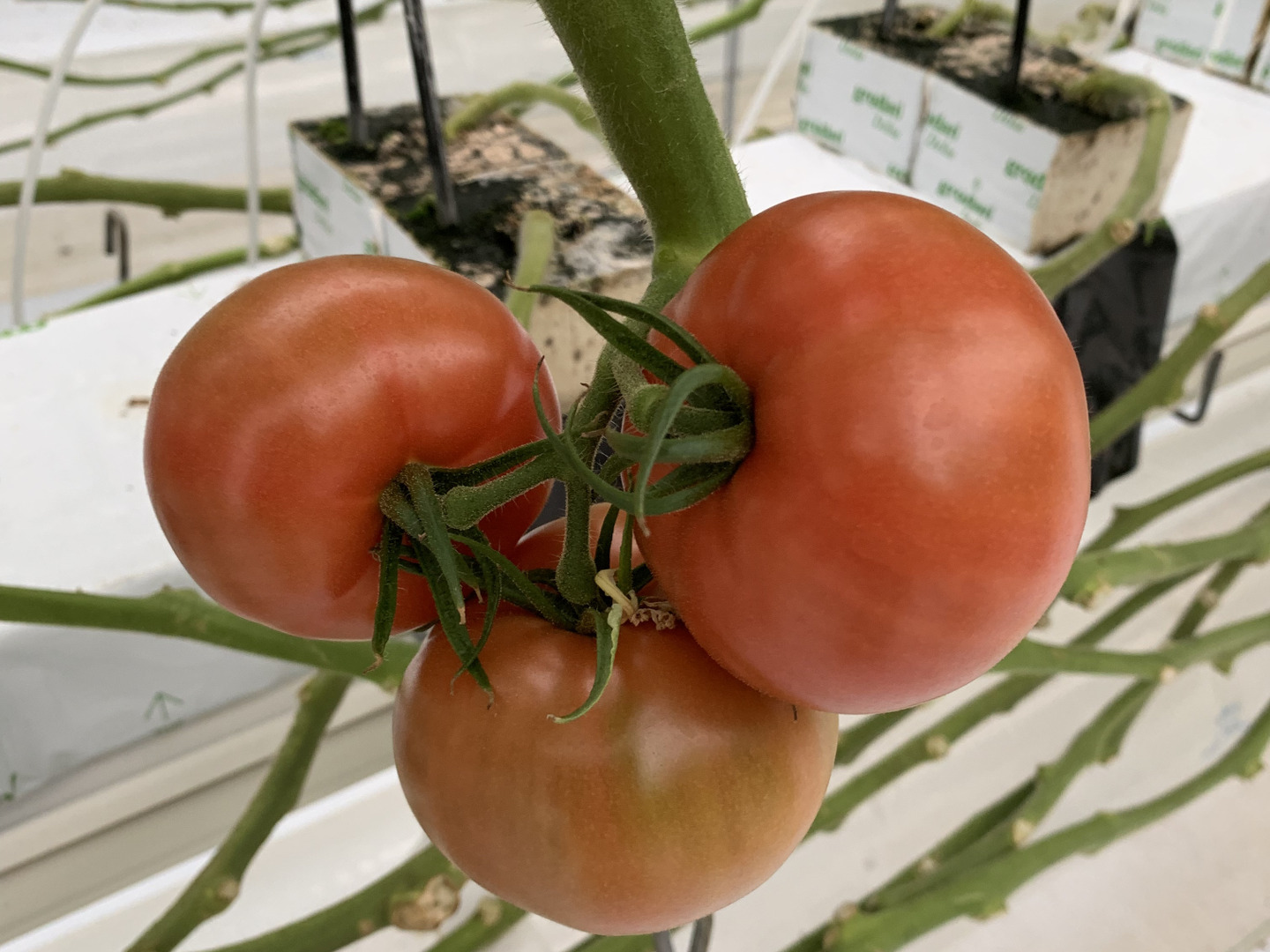 M.K.ファームでは環境制御システムを導入していますので病気対策としまして湿度が88%以上になると除湿するように設定しています。ハウス内の空気を循環扇や暖房機の送風を使い24時間動かしていますので従来の栽培方法より病気のリスクが低くなっていますので薬剤散布回数も従来の50%以下に抑えられています。