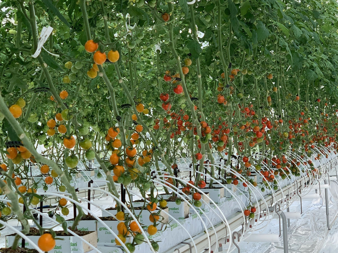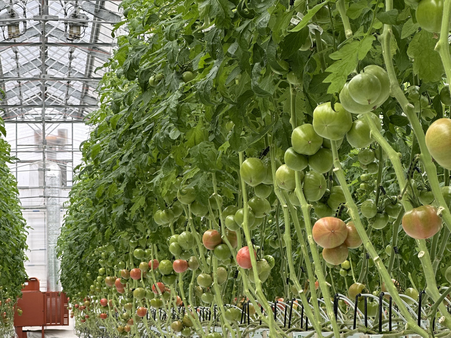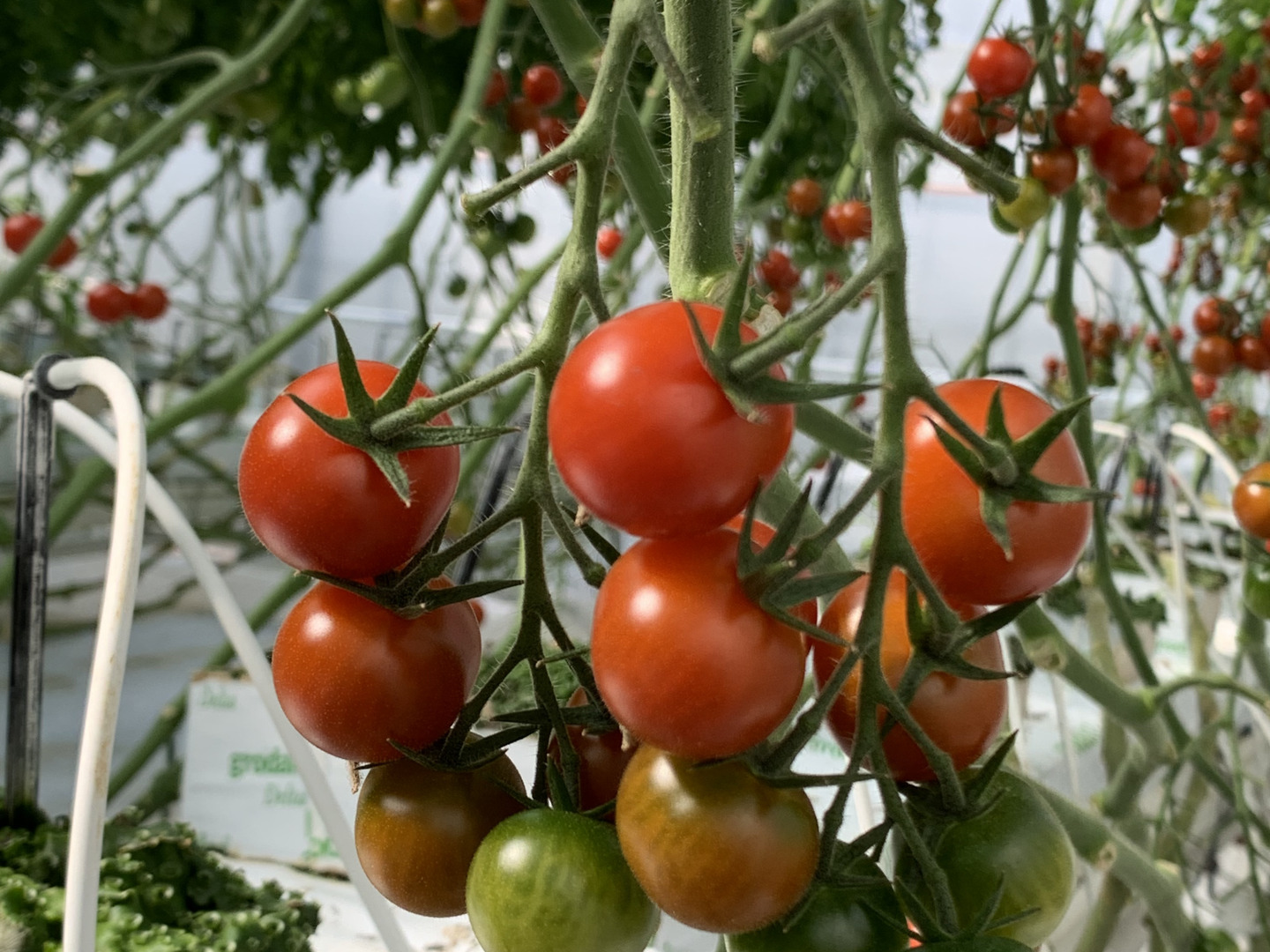 環境制御システムを導入したスマート農業によりハウス内環境の見える化をしトマトに最適な環境で栽培をしています。測定項目はハウス内の温度・湿度・CO2・培地温・カーテン上温度、外気では風速・風向・日射量・雨・雨量を365日、24時間、1分ごとに測定しています。測定した環境データをもとに設定をし従来の栽培方法より細やかな管理をする事によって光合成を最大化させ高品質、高収量を実現させています。