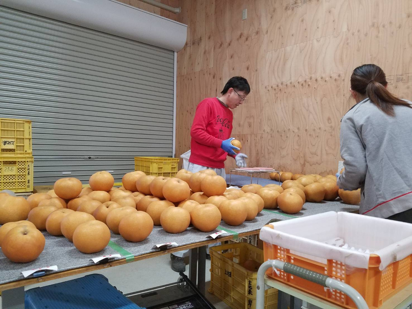 一つ一つの梨に日光がよく当たるように枝を配置し、大きな梨に育つように着果制限して育てます。