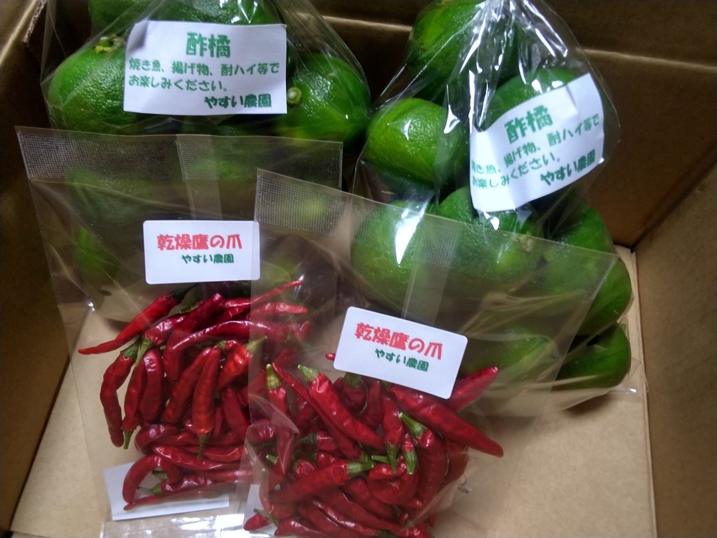 酢橘500g入り2袋、乾燥鷹の爪1Og入り2袋