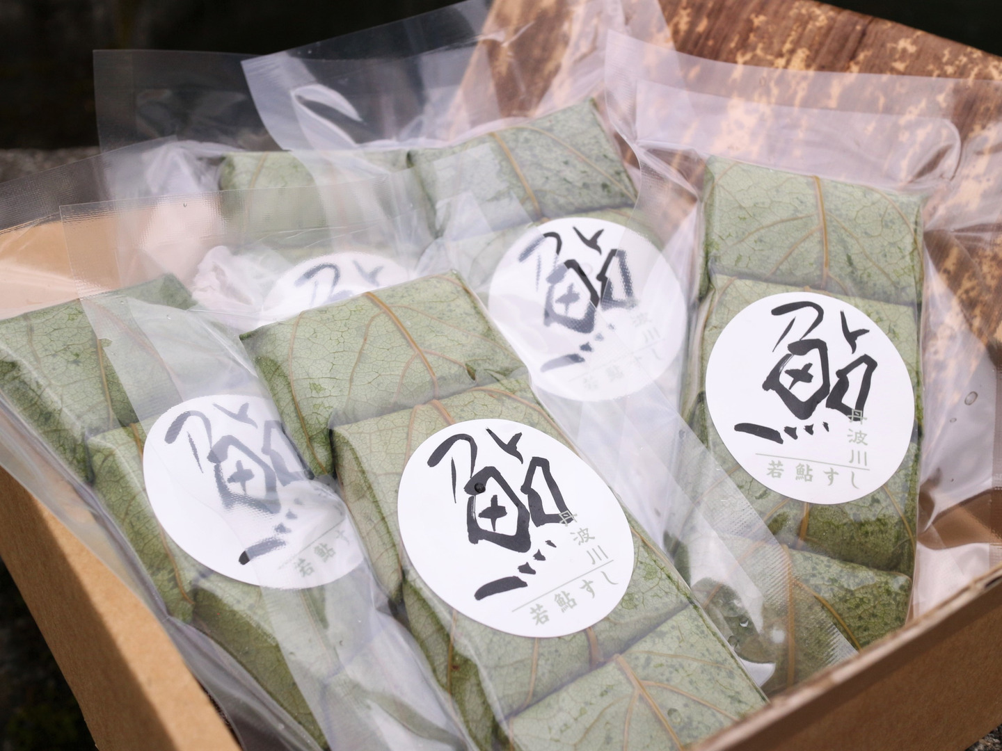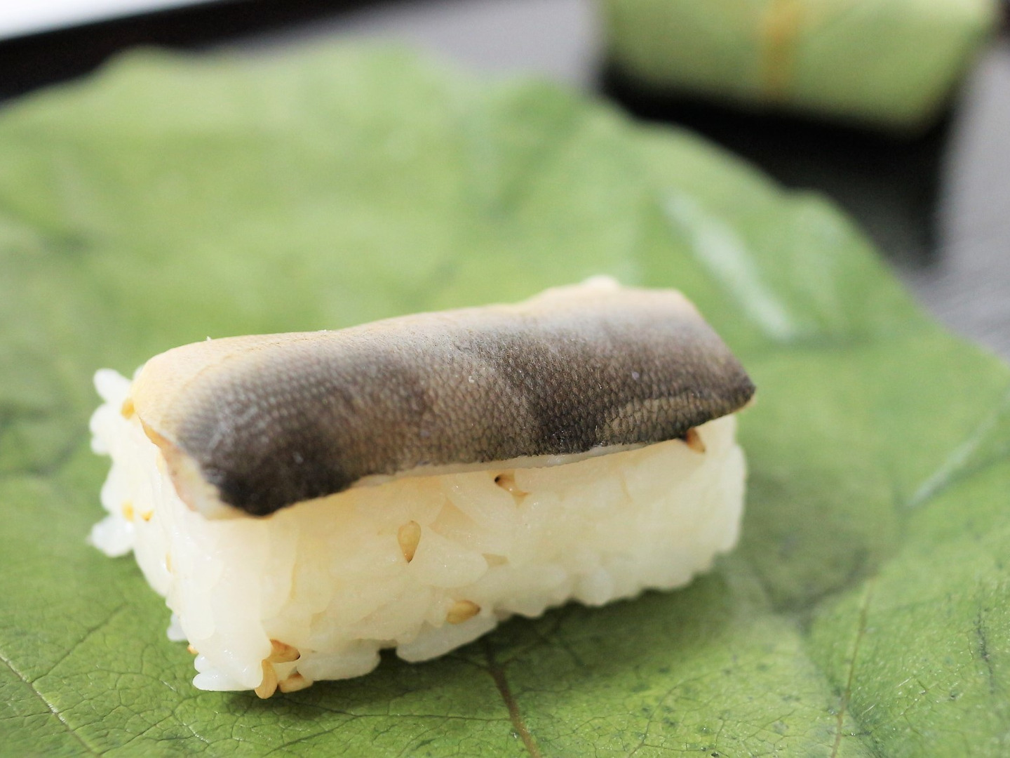 鮎は皮に特有の味があり、丸ごと味わっていただくために一口サイズの握り寿司の形にしました。そしてフィンガーフードとしても気軽にお召し上がりいただけるように保存性が高く、抗菌作用のある柿の葉で包みました。