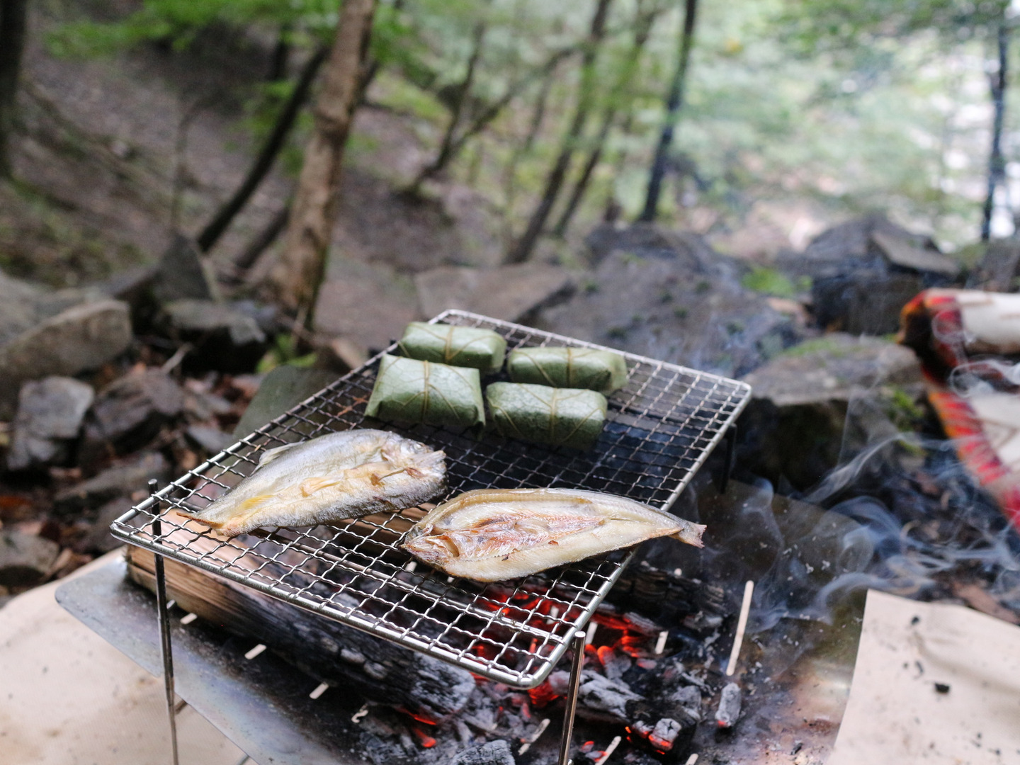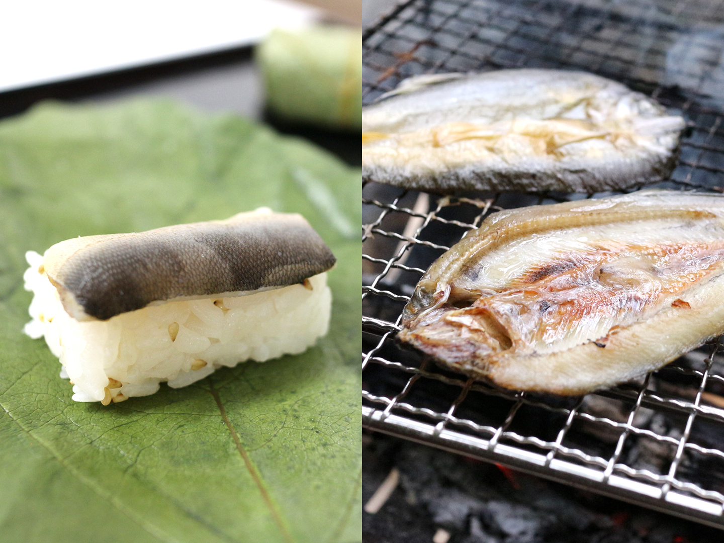 素朴な一口サイズのお寿司と川のほとりで風干ししたひものをセットにしました。
